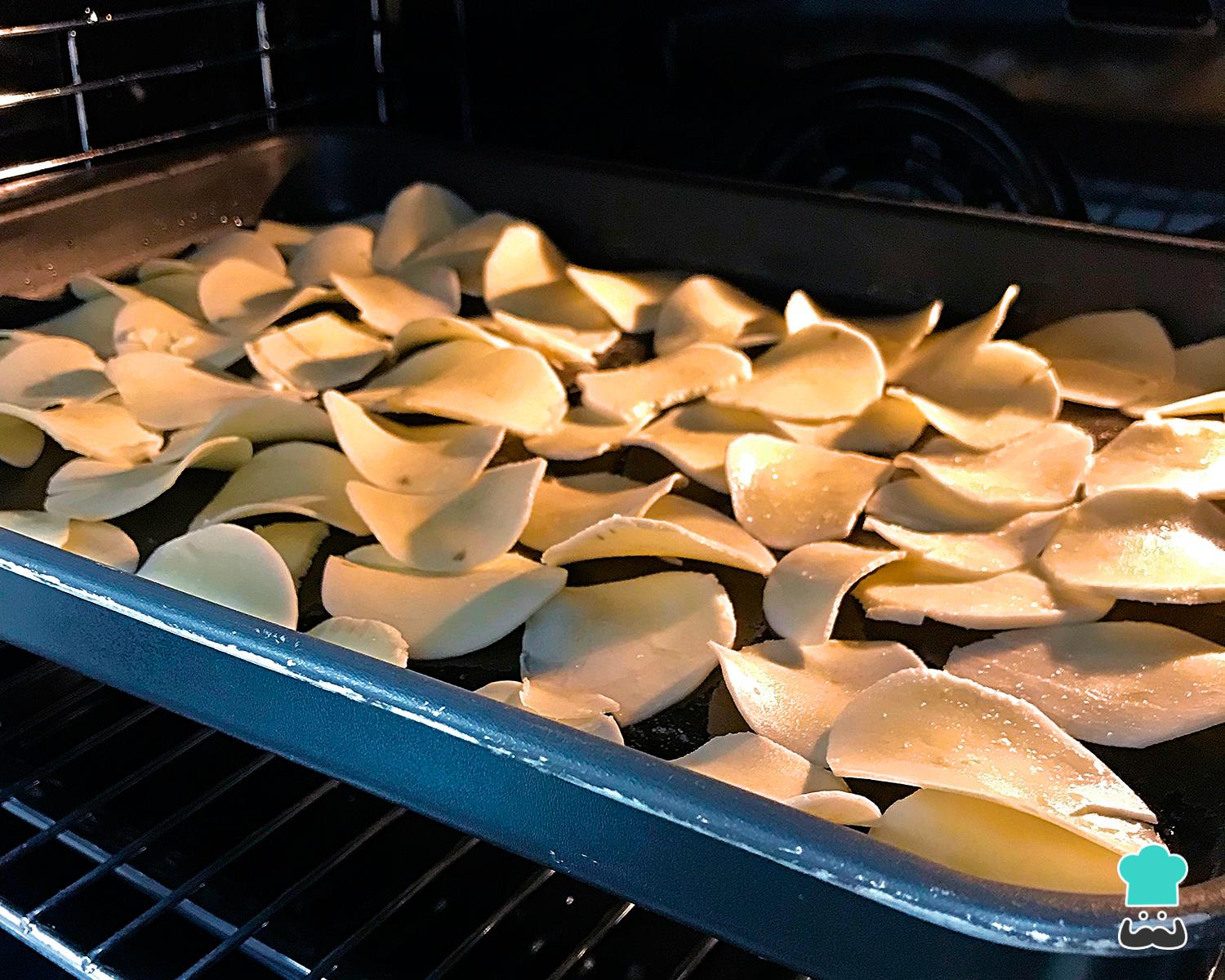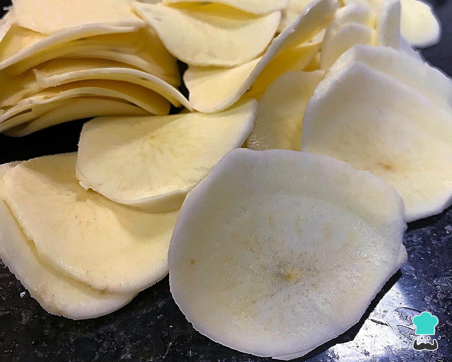 Dica: Tente não deixar uma fatia sobre a outra, assim os chips ficarão mais crocantes.