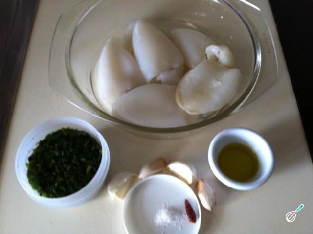 Comece por preparar os ingredientes necessários para fazer as choco frito com alho: os chocos serão acompanhados com alho, salsinha, pimenta Caiena, sal e azeite.