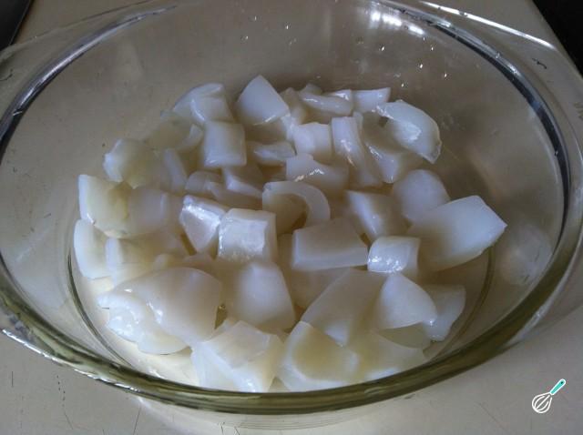 Limpe bem os chocos, corte-os em cubos e reserve.