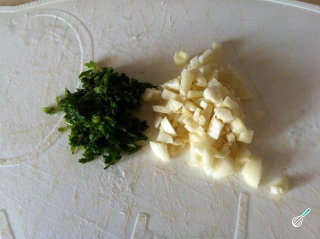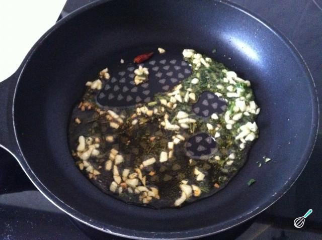 Coloque azeite em uma frigideira e, quando estiver quente, adicione o alho, a salsinha e a pimenta Caiena.