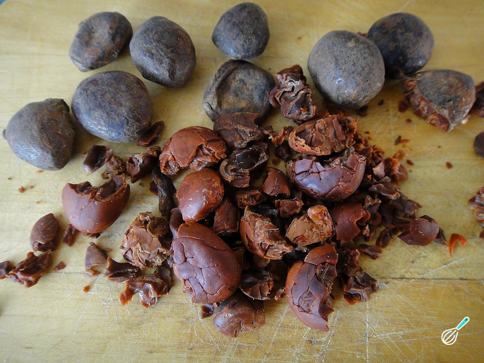 Em seguida descasque as sementes de cupuaçu, sem deixar vestígio algum da casca (caso contrário seu cupulate irá amargar). Para isso, corte uma ponta e abra a casca com uma faca, sem partir as sementes.