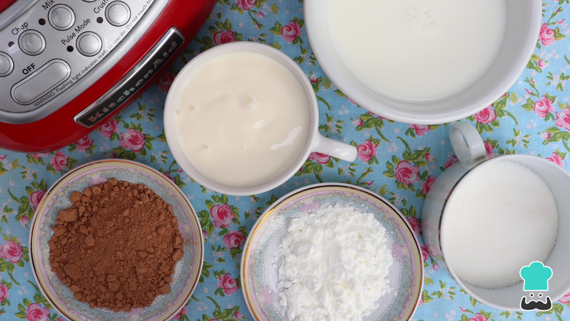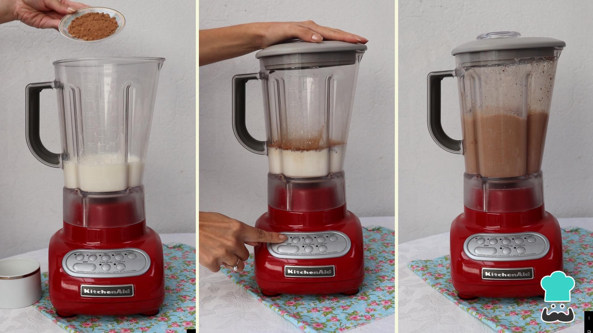 Comece batendo no liquidificador o leite, o amido, o chocolate em pó e o açúcar até dissolver todos os pedacinhos.