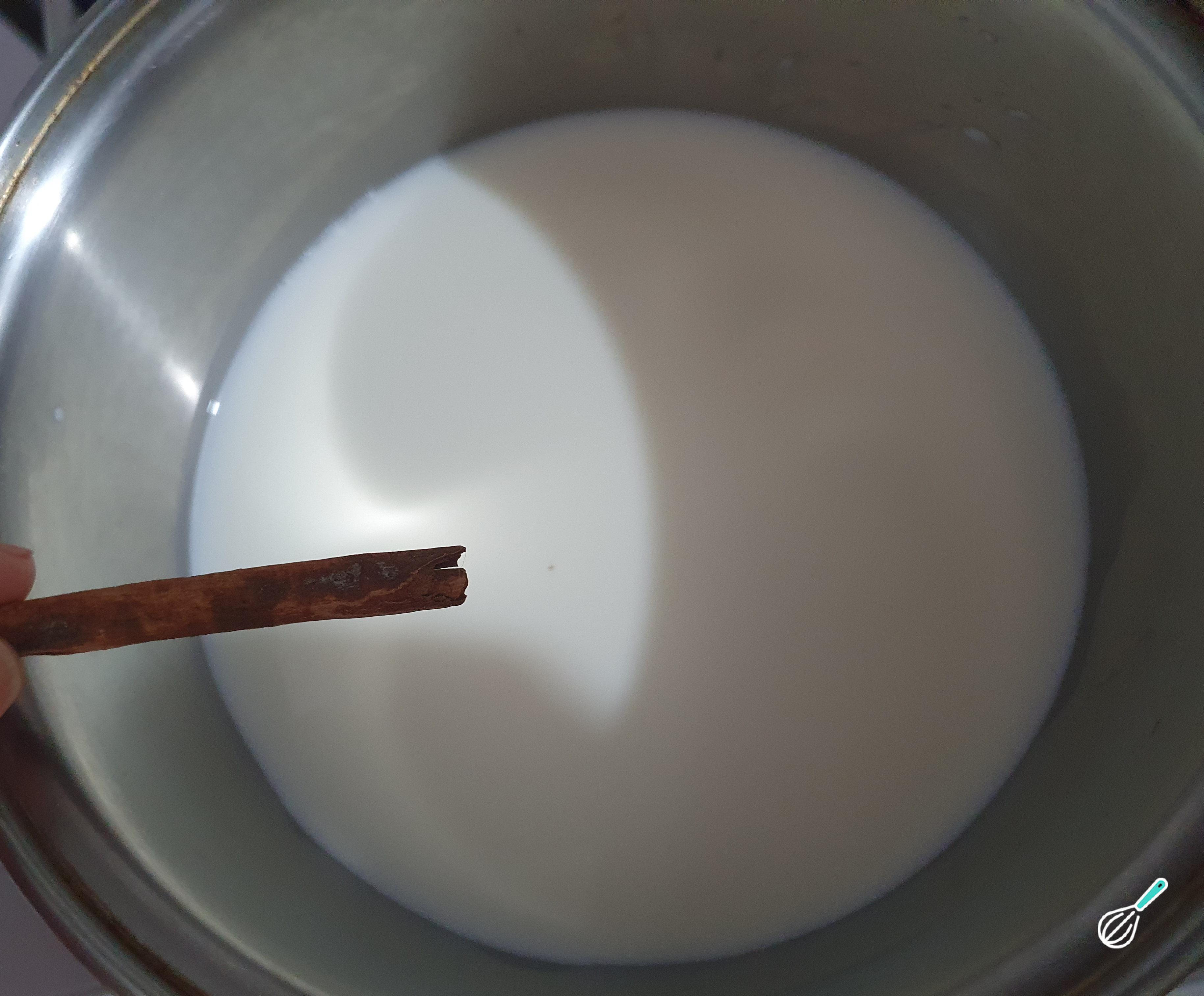 Coloque o leite na panela com os dois paus de canela .