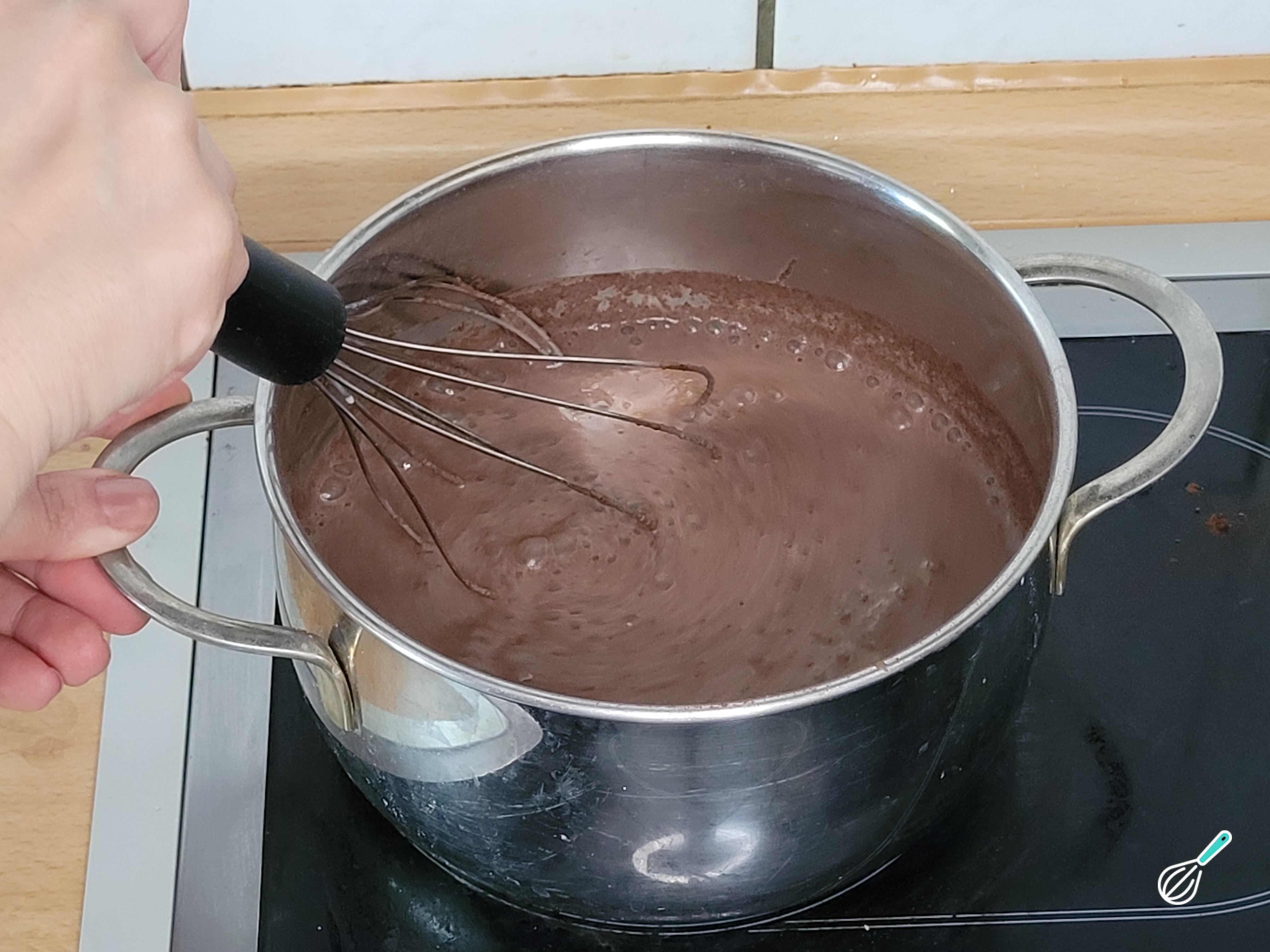 Com o fogo ainda desligado, mexa muito bem, de preferência com um batedor de arame, para garantir que todos os pedacinhos de cacau e amido foram bem dissolvidos ao leite