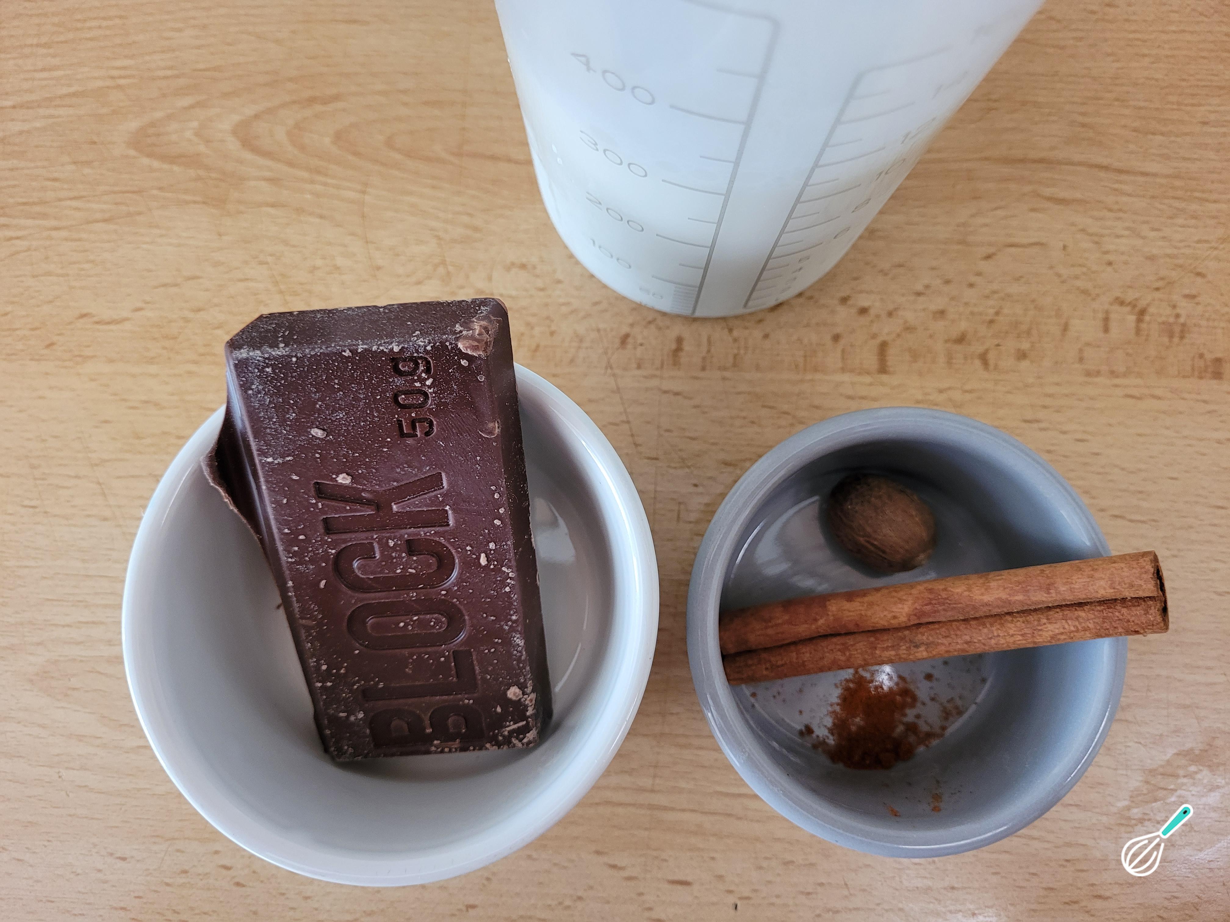 Separe todos os ingredientes para fazer o seu chocolate quente fit: leite, chocolate em barra 70%, pimenta caiena, canela em rama e noz moscada ralada