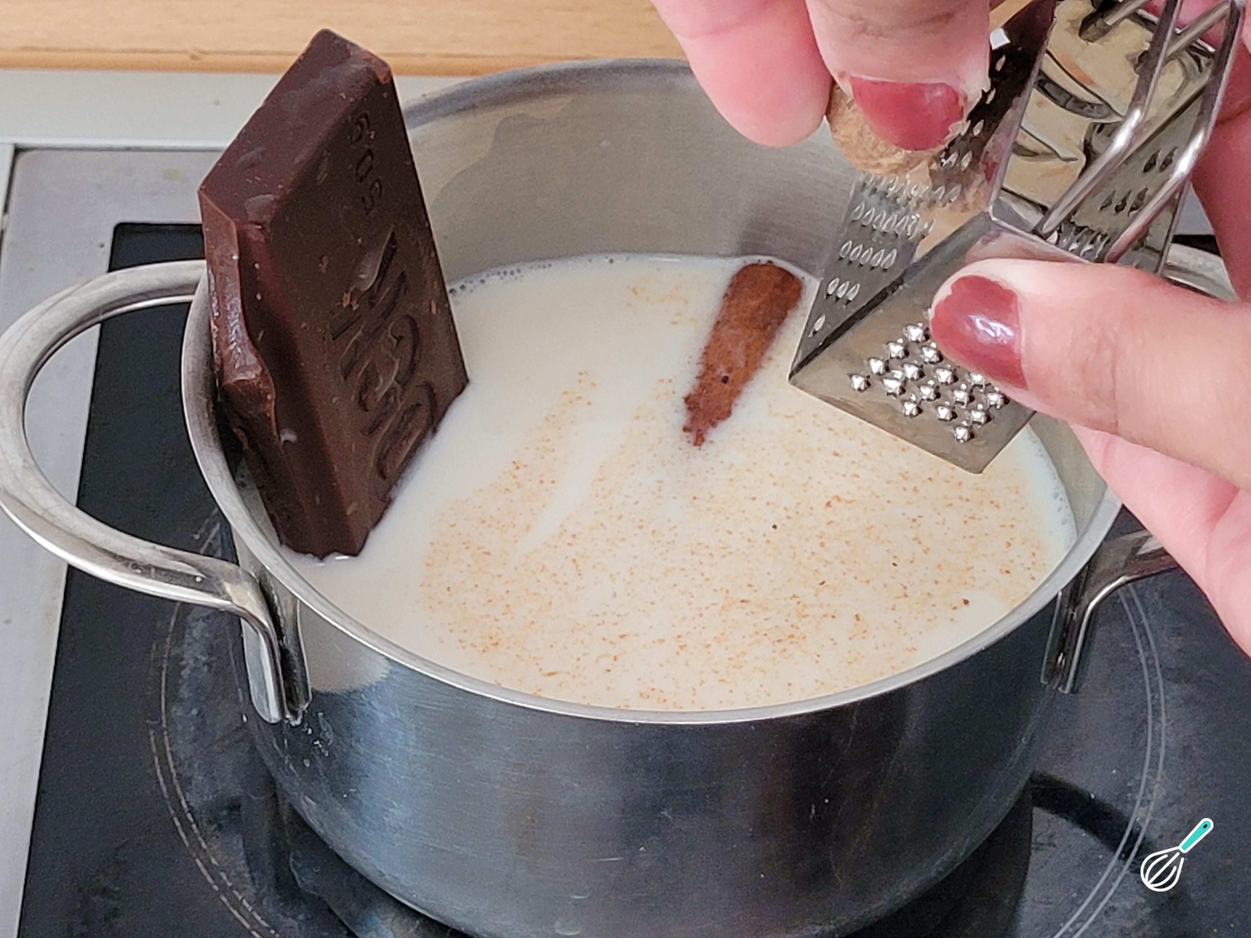 Em uma panela desligada, adicione o leite, o chocolate, a canela em rama e a pimenta caiena e rale a noz moscada. Se desejar, pode adoçar com mel ou como preferir.