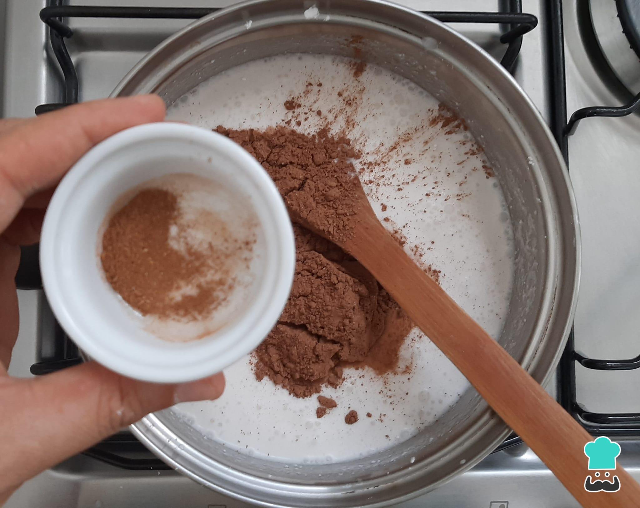 Adicione o cacau em pó, o açúcar e a canela em pó, misturando novamente.