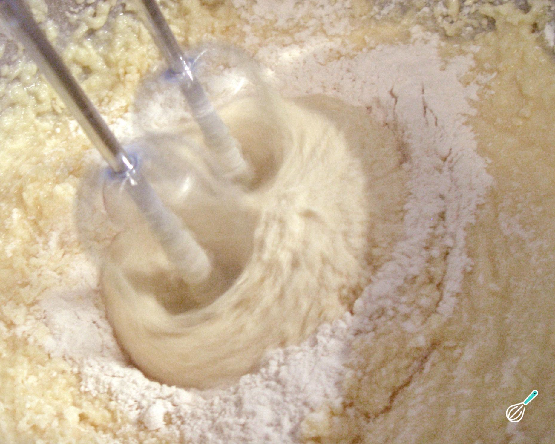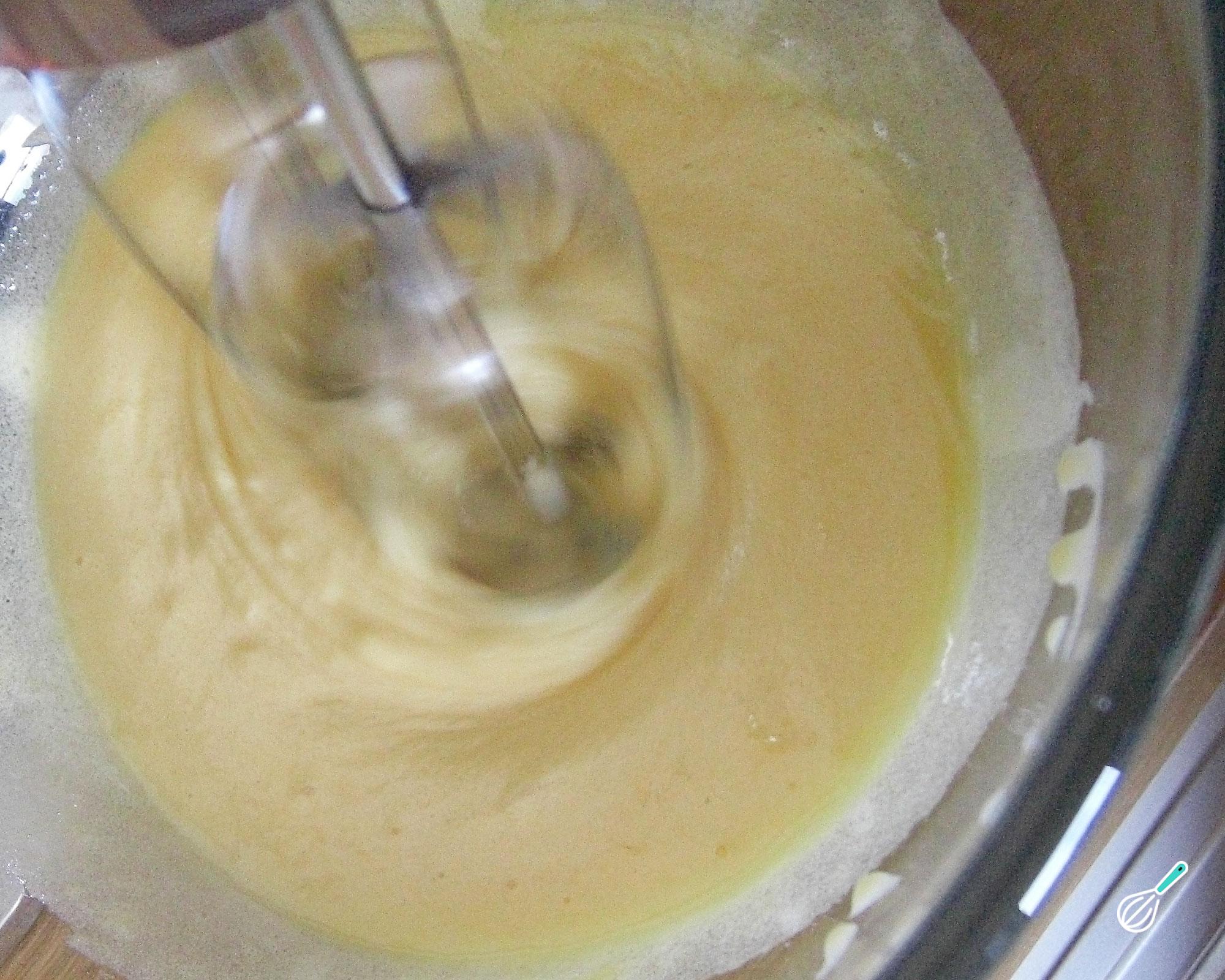 Bata os ovos (gemas e claras) com o adoçante e as raspas de laranja e de limão até dissolver bem o adoçante. Pode fazer isso na batedeira ou simplesmente com um garfo.