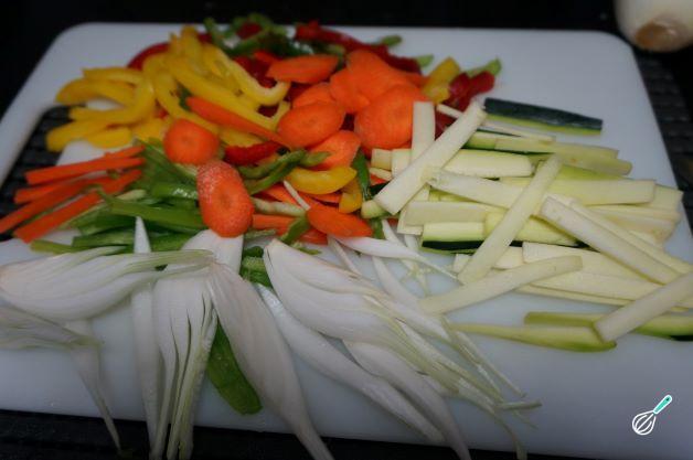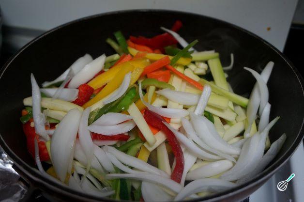 Para preparar o chop suey de legumes, primeiro lave os legumes. A seguir, corte os pimentões em tiras, a cebola em quartos e cada quarto ao meio, você pode cortar a cenoura em tiras ou cortar em rodelas bem finas. Lave as abobrinhas, corte as pontas e depois, em 2 ou 3 partes, depois corte cada parte em tiras finas.