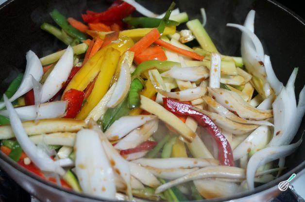 Depois de refogado o chop suey de legumes, verifique se o ponto de sal está bom e retire do fogo.