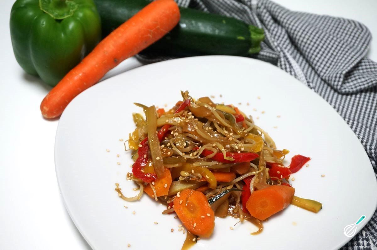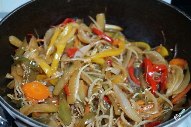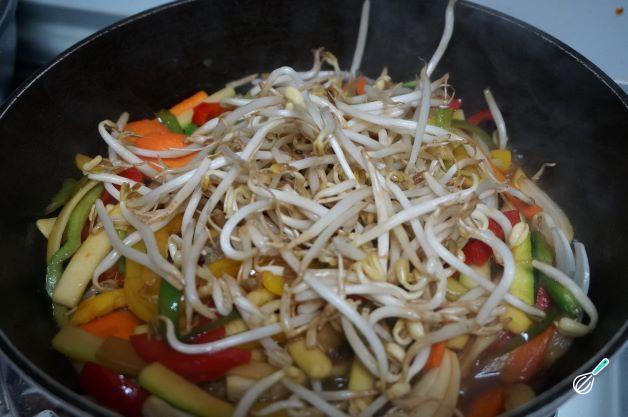 Coloque a frigideira em fogo alto com 2-3 colheres de sopa de óleo de gergelim ou girassol e coloque os os dentes de alho picados. Refogue por alguns minutos e depois incorpore todos os outros legumes, exceto o broto de feijão. Cozinhe os legumes por cerca de 5 minutos sempre mexendo.