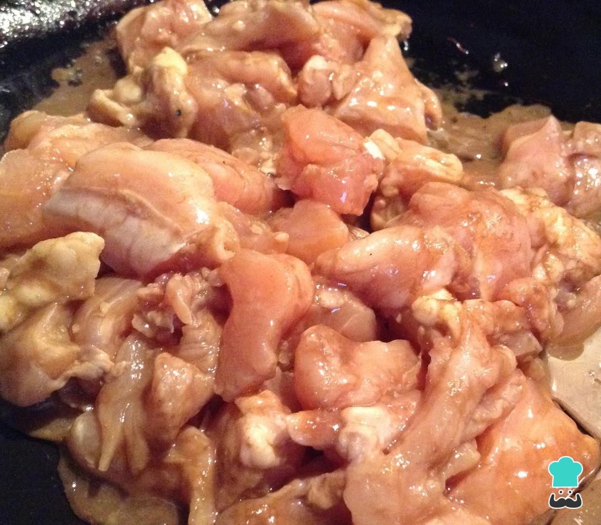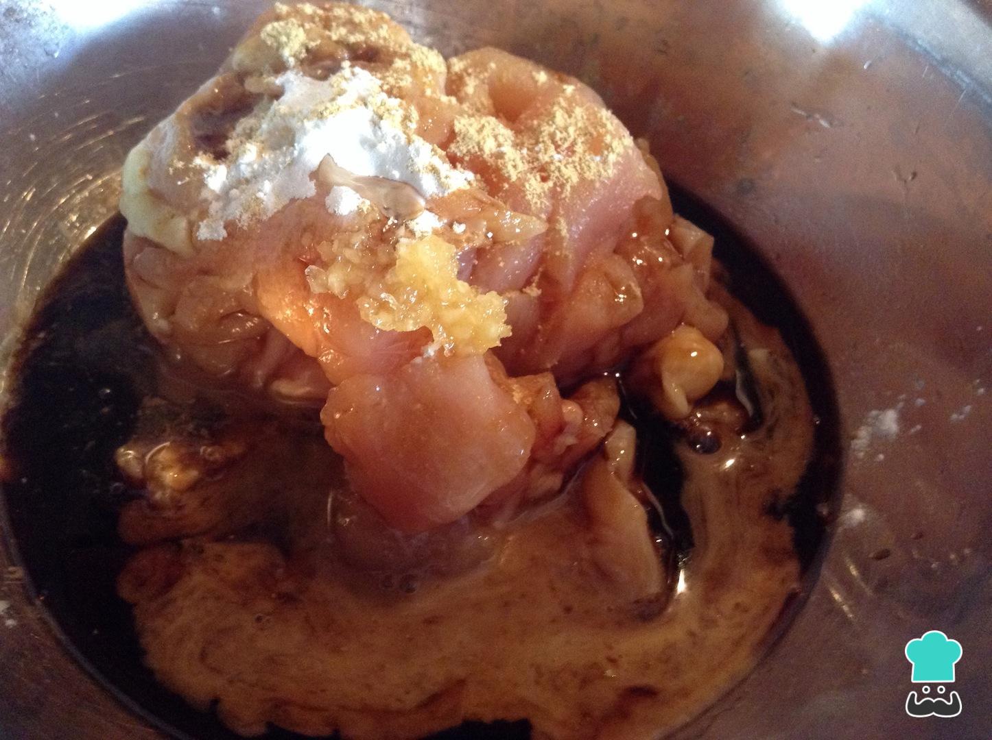 A primeira coisa a fazer nesta receita é pôr o frango a marinar. Corte o peito de frango em cubos médios numa taça ou tigela e adicione o molho de soja, o açúcar mascavo, o molho de peixe, o amido de milho, a pasta de alho, a pimenta, o gengibre e a polpa de tamarindo. Envolva bem os ingredientes nos condimentos e ponha o recipiente na geladeira.