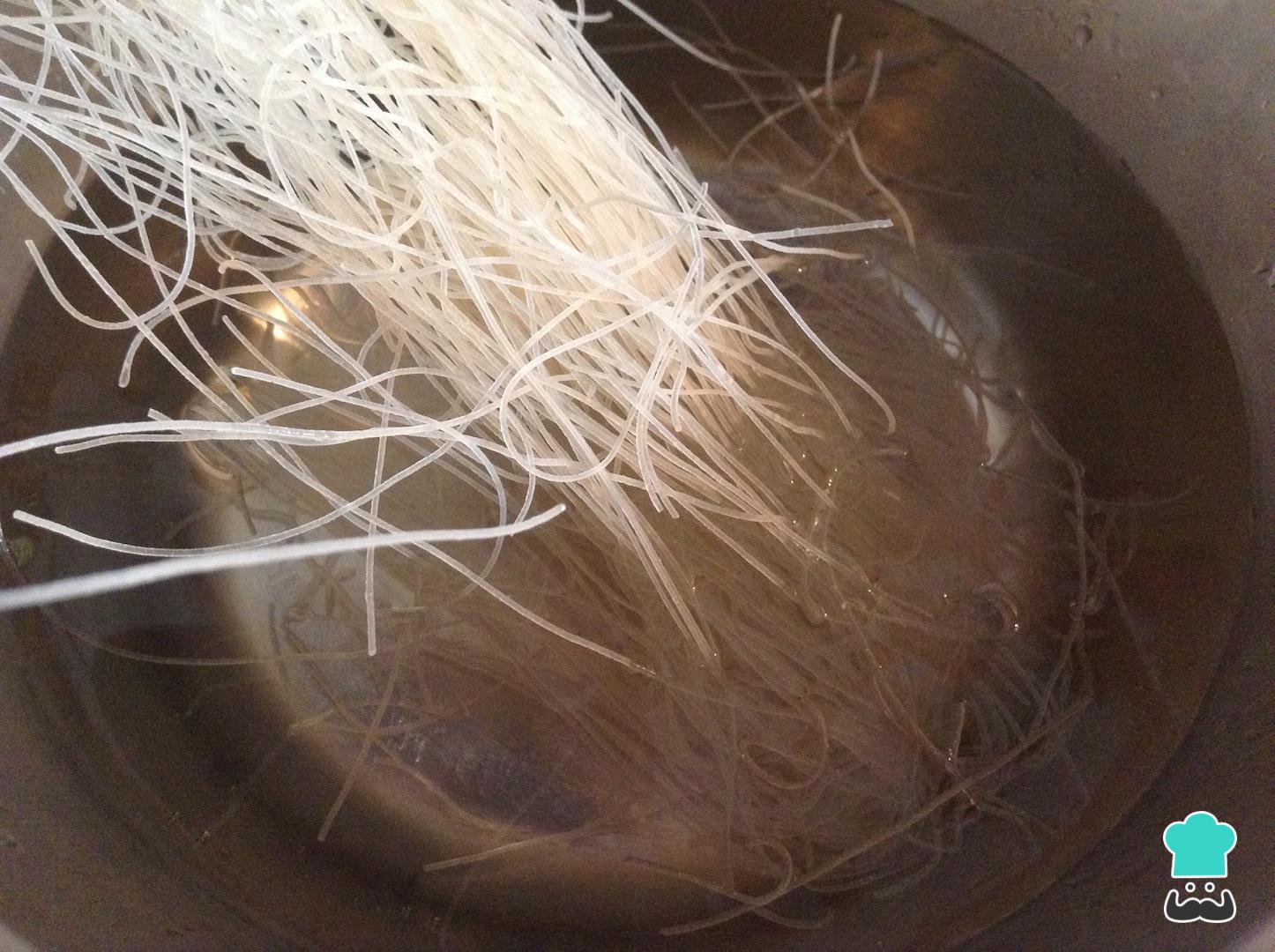 Enquanto o frango marina na geladeira, ponha os noodle de arroz numa tigela com água suficiente para os hidratar. É importante que a água esteja fria.
