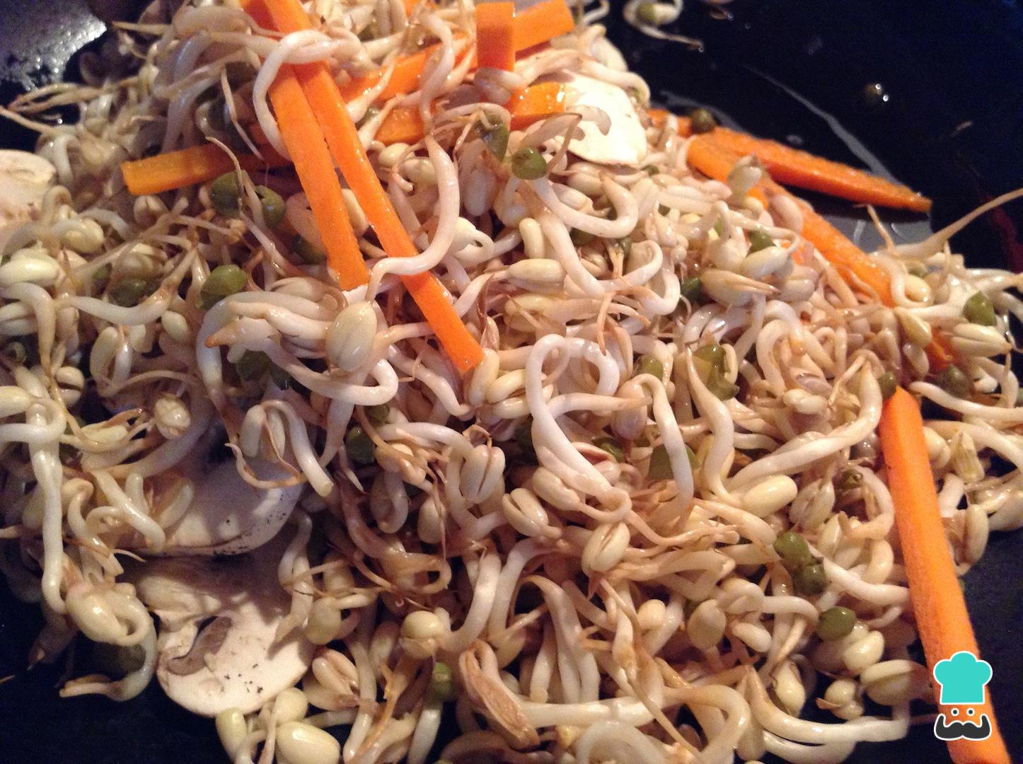 Leve uma frigideira ao fogo médio e adicione um pouco de óleo de girassol, refogue os rebentos de soja, a cebolinha e a cenoura cortada em juliana muito fina, por cinco minutos aproximadamente. Retire do fogo.
