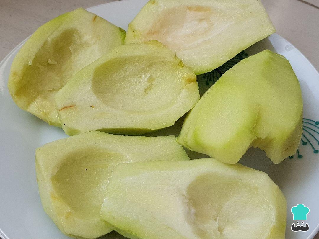 Descasque e lave os chuchus. Corte-os pela metade, longitudinalmente, e retire a parte do meio escavando um pouco os chuchus, para que seja mais fácil acomodar o recheio.