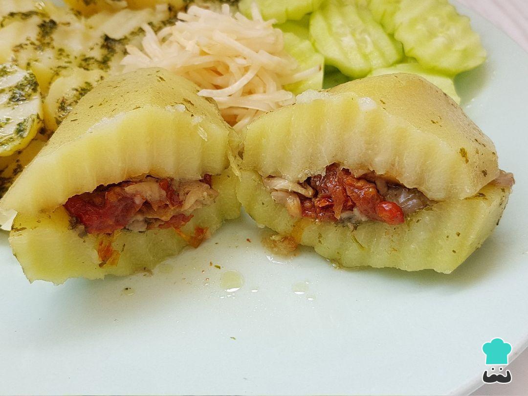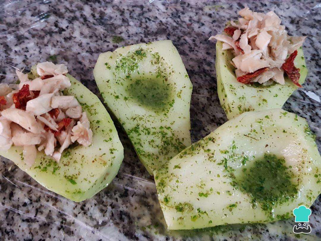 Em seguida pique finamente os tomates secos e os cogumelos e recheie os chuchus com esses dois ingredientes.