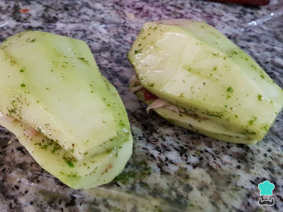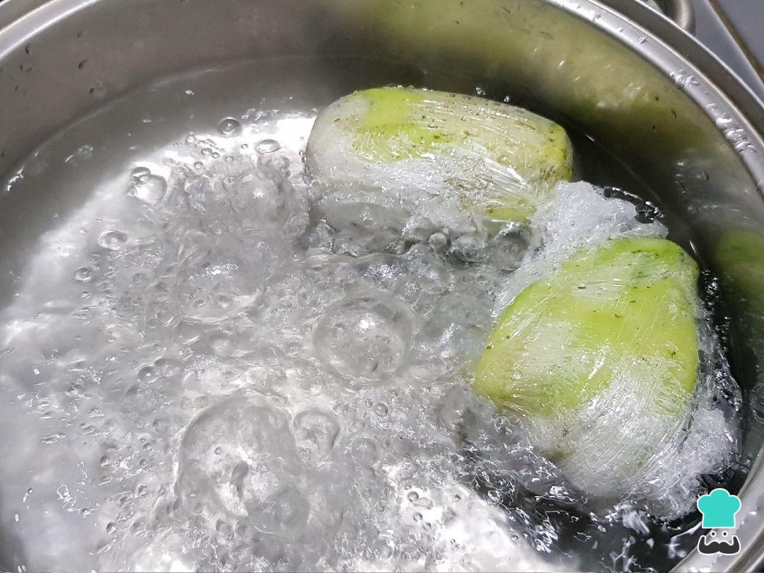 Leve ao fogo uma panela com água fervente até metade e cozinhe nela os chuchus recheados e muito bem embrulhados em plástico filme até ficarem macios (mais ou menos 20-25 minutos).