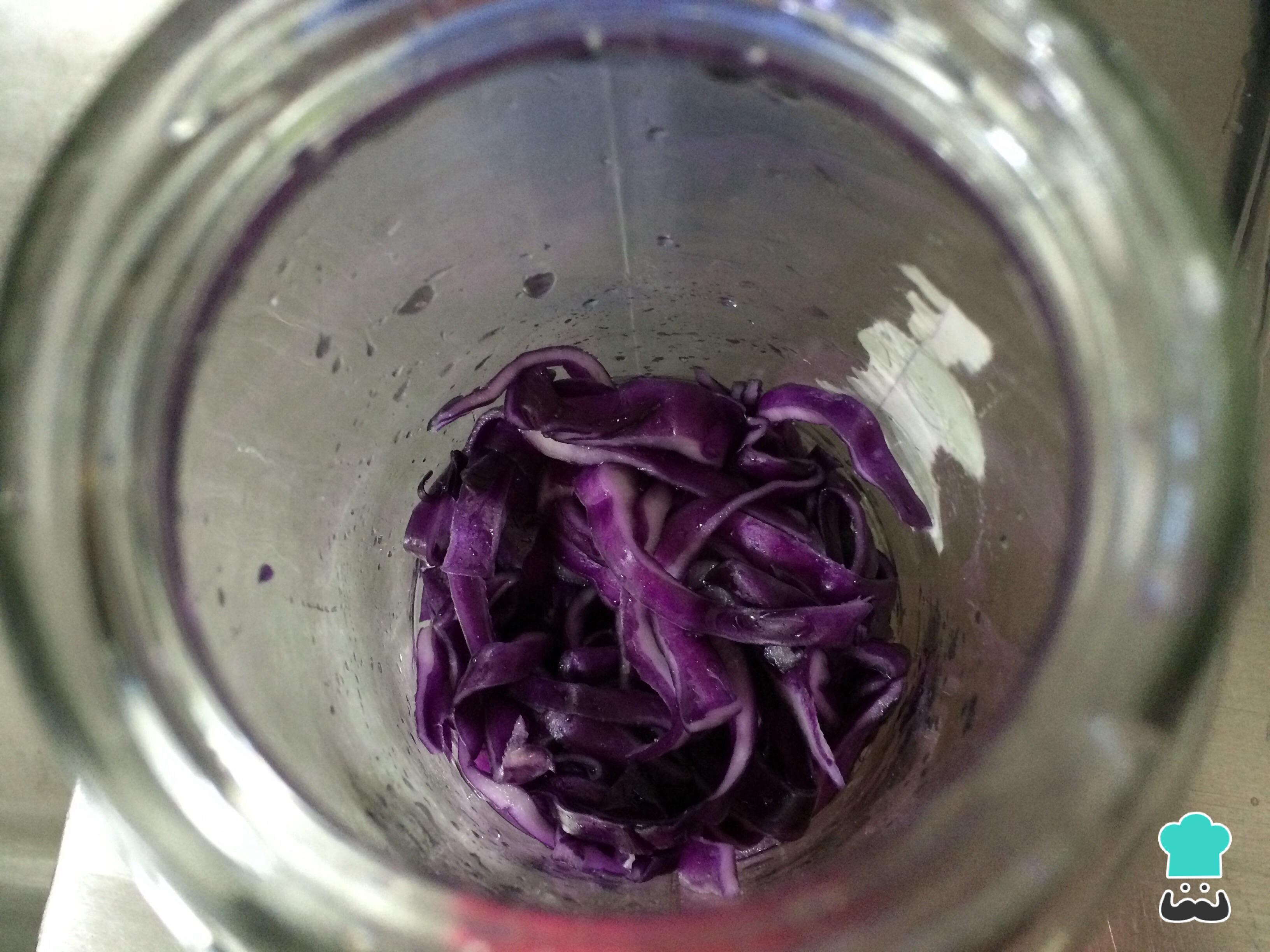Deixe repousar o repolho por 15 minutos ou até murchar e soltar água. Depois aperte bem com as mãos, para escorrer o excesso, reserve a água que ele soltou (chamada de salmoura) e enxague o legume com água filtrada.
