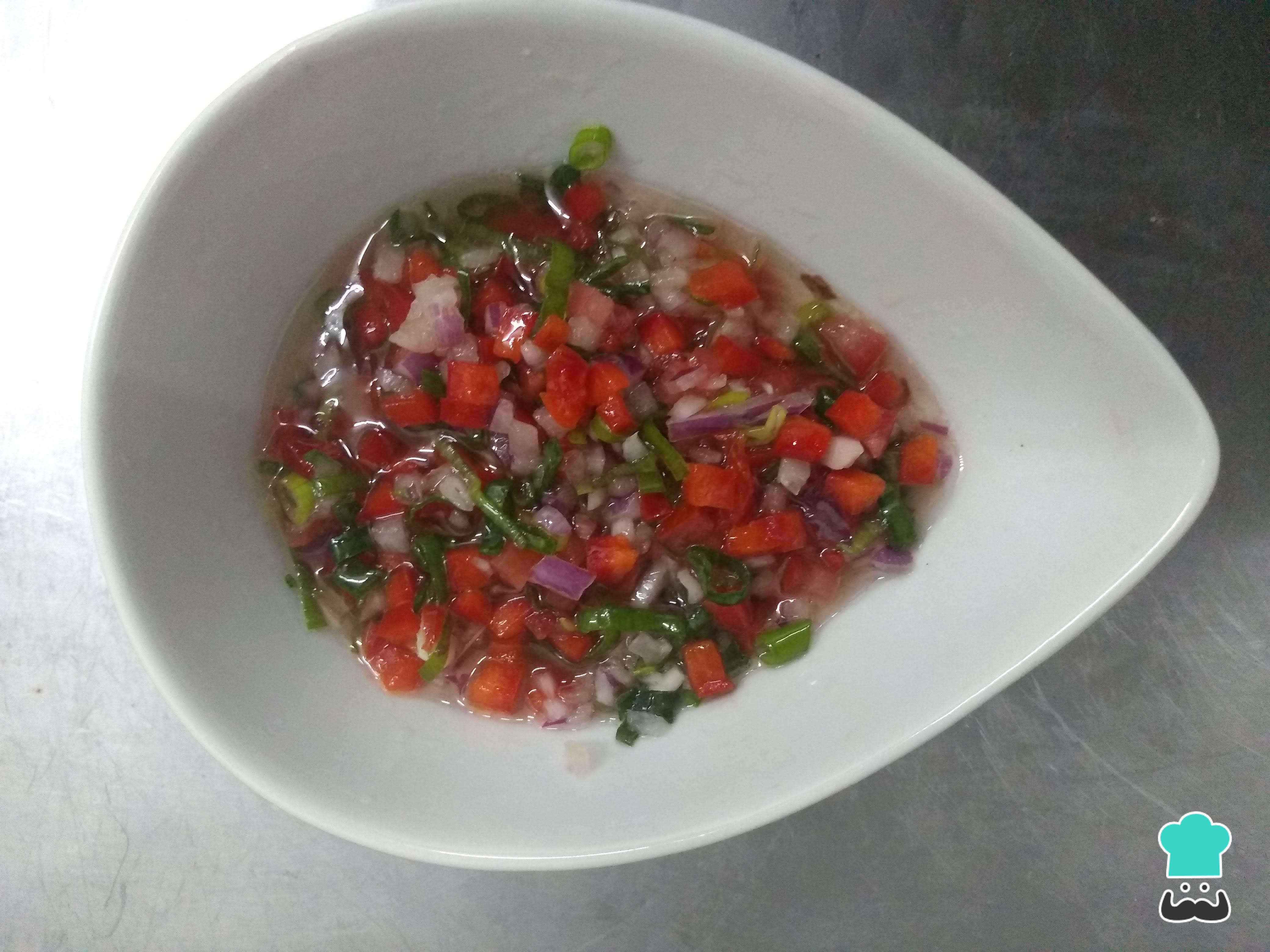 Coloque todos os ingredientes cortadinhos em um recipiente e adicione azeite, vinagre, sal e pimenta. Misture bem e reserve esse delicioso molho argentino para churrasco, também chamado de salsa crioula, até o momento de servir.