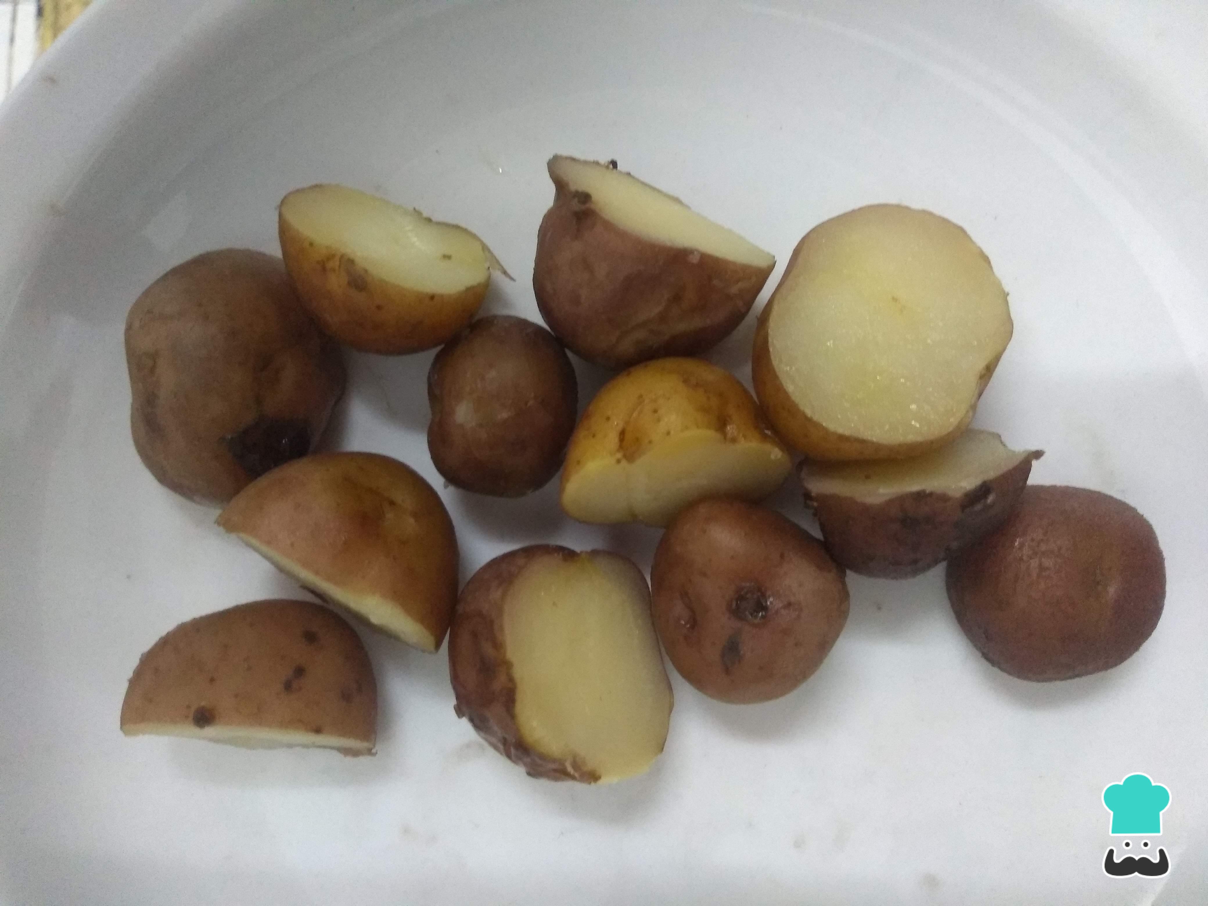 Quando as batatas já estiverem cozidas, escorra e corte na metade.