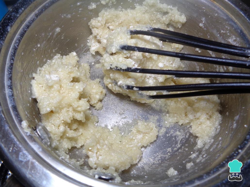 Quando ferver, baixe o fogo e adicione a farinha pouco a pouco, enquanto mistura com uma colher de pau ou batedor de mão. Fique misturando muito bem até a massa começar desgrudando da panela.