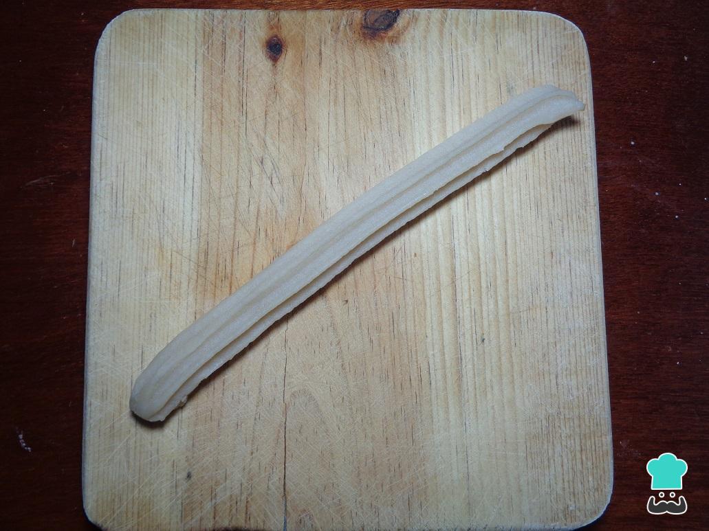 Para conferir o formato típico a este churro caseiro coloque a massa de churro num saco de confeiteiro com um bico pitanga. Pressione para conseguir churros com comprimento a seu gosto.