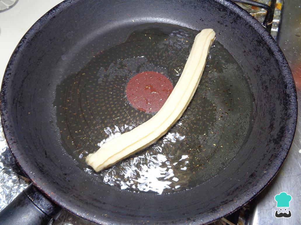 Depois de modelar os churros, frite em uma frigideira com o óleo quente. Vire de vez em quando para dourar por todos os lados e retire para um prato com papel absorvente.