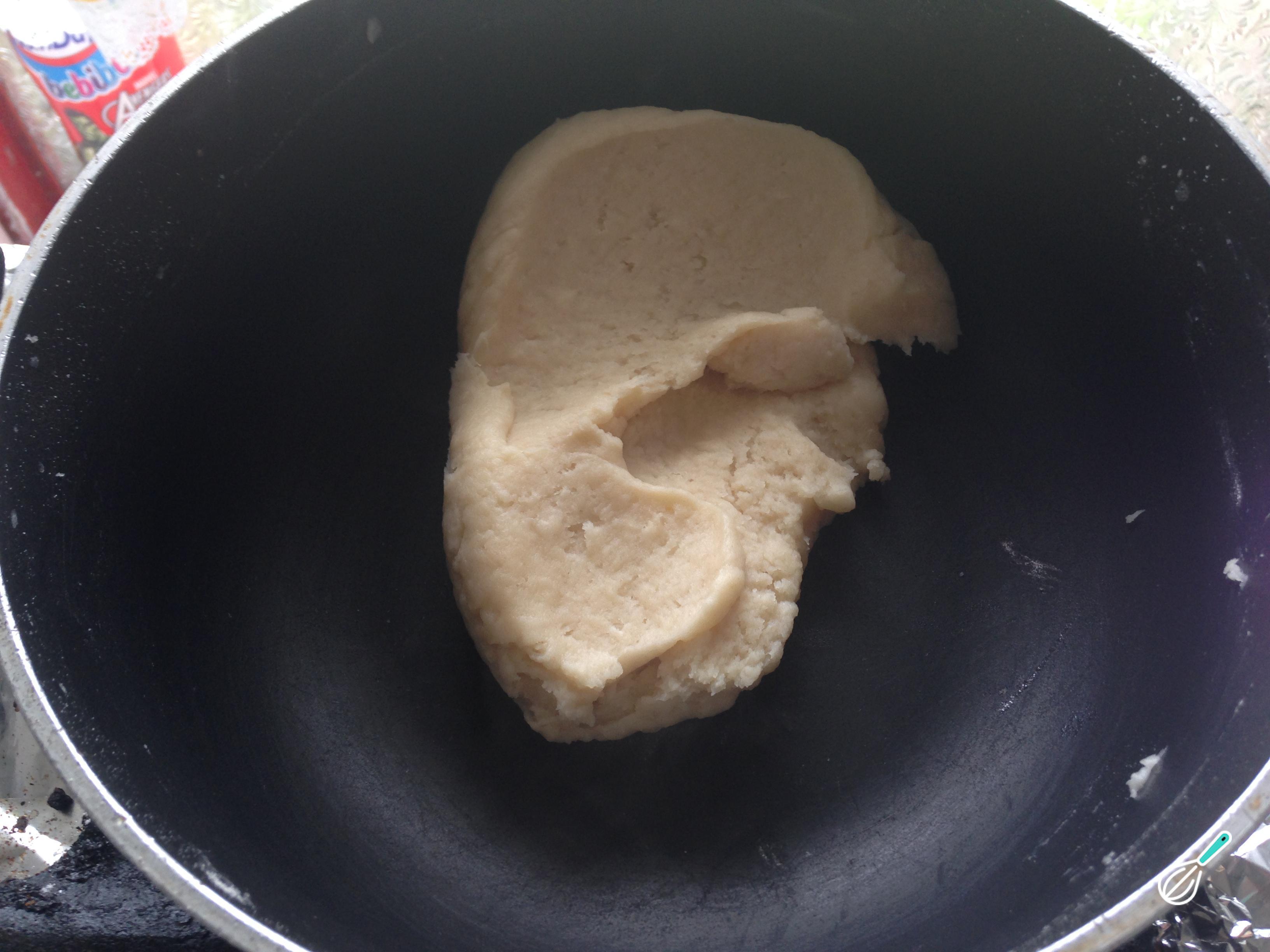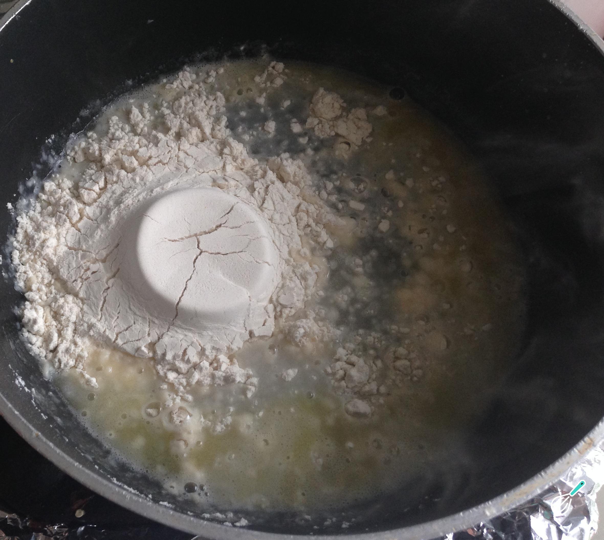 Quando a água estiver fervendo, adicione toda a farinha e mexa sem parar até obter uma massa que desgruda.