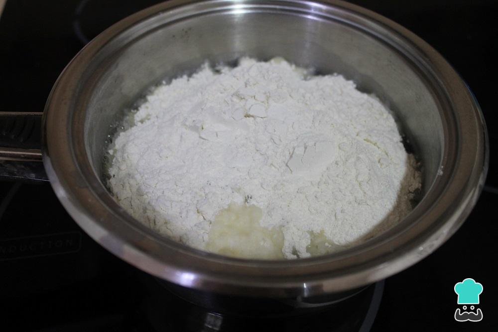 Quando a água ferver, retire a panela do fogo e adicione a farinha de uma só vez e o açúcar. Mexa com uma colher de madeira, misturando bem e desfazendo todos os grumos. A massa deverá ficar lisinha e um pouco mole.