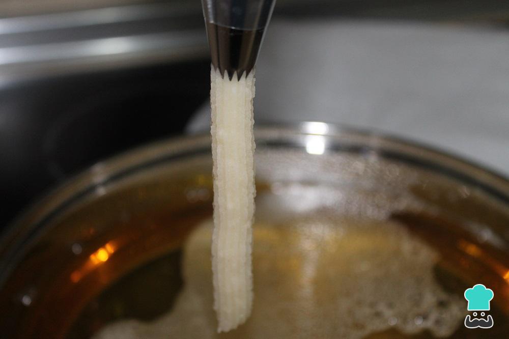 Esquente o óleo numa panela e, quando estiver bem quente, baixe um pouco o fogo e coloque porções da massa fritando. Deixe fritar e retire quando os churros estiverem douradinhos.