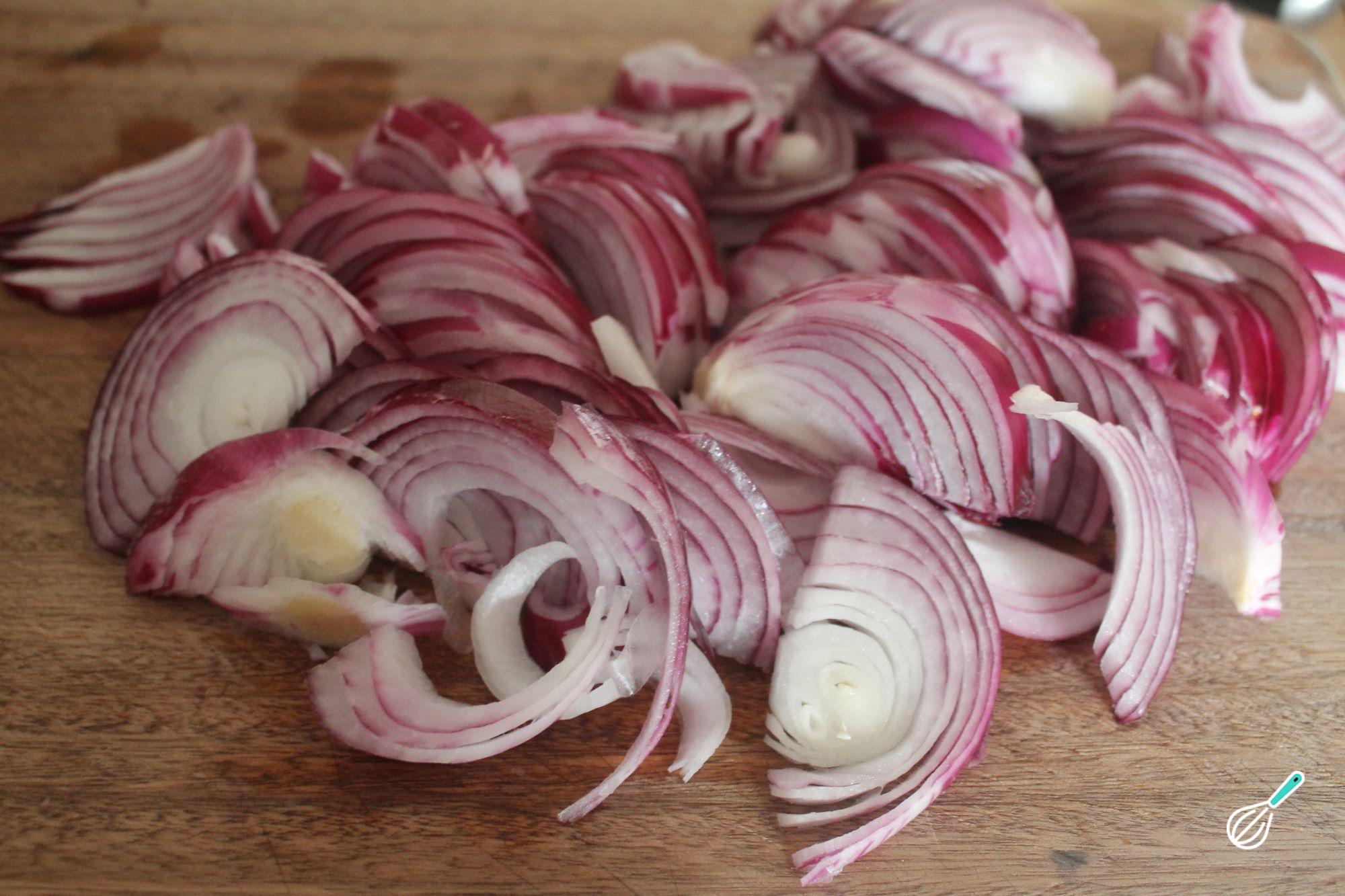 Para começar a receita de chutney de cebola, primeiro prepare as cebolas, descascando-as, cortando-as ao meio e as metades em tiras julianas.
