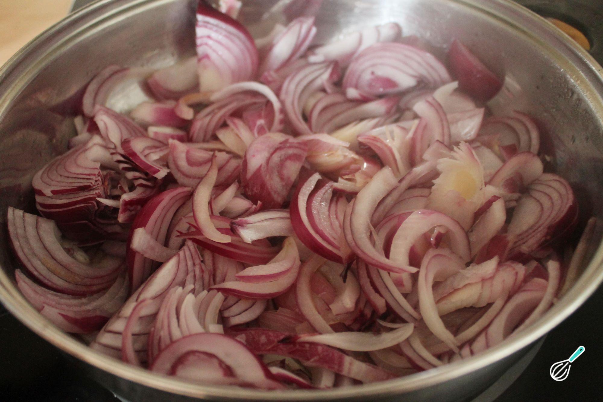 Em uma panela grande, adicione três colheres de azeite e, quando estiver quente, adicione as cebolas cortadas em formato juliana. Refogue mexendo de vez em quando, por 20 minutos, em fogo baixo para que confitem aos poucos.