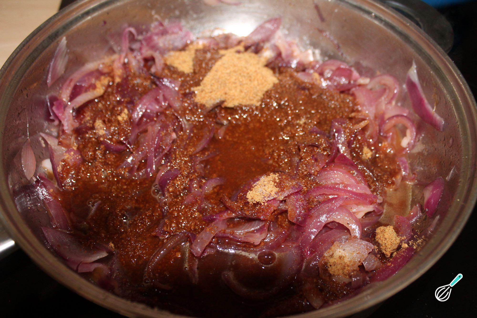Após 20 minutos, adicione uma colher de chá de sal, a pimenta-do-reino a gosto (você também pode adicionar bolinhas de pimenta se preferir), o açúcar mascavo e o vinagre. Mexa e cozinhe por mais 20 minutos em fogo baixo. Nessa etapa, você não precisará mexer os ingredientes. O chutney de cebola caramelizada está quase pronto!