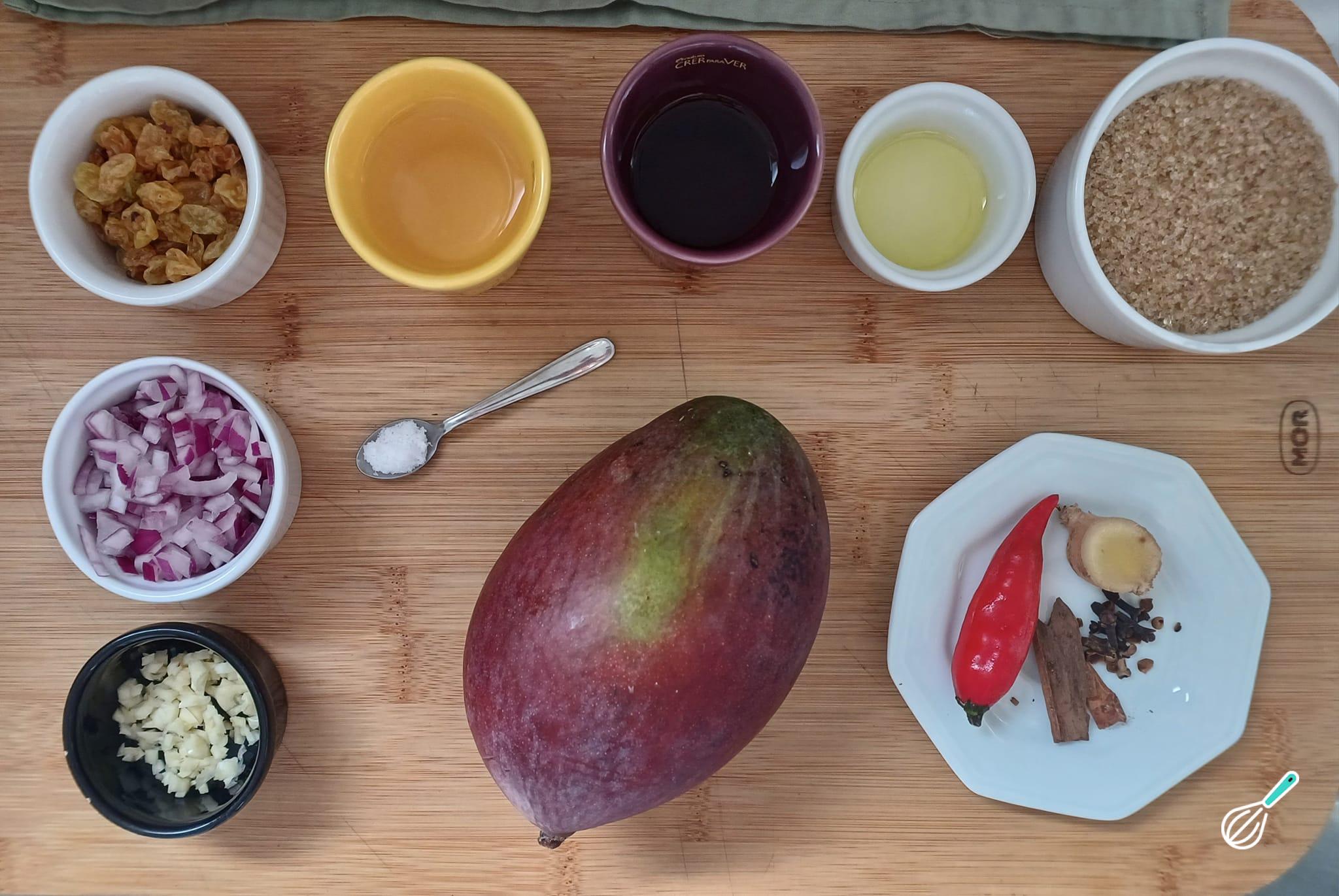 Separe os ingredientes para o preparo da receita de chutney de manga.