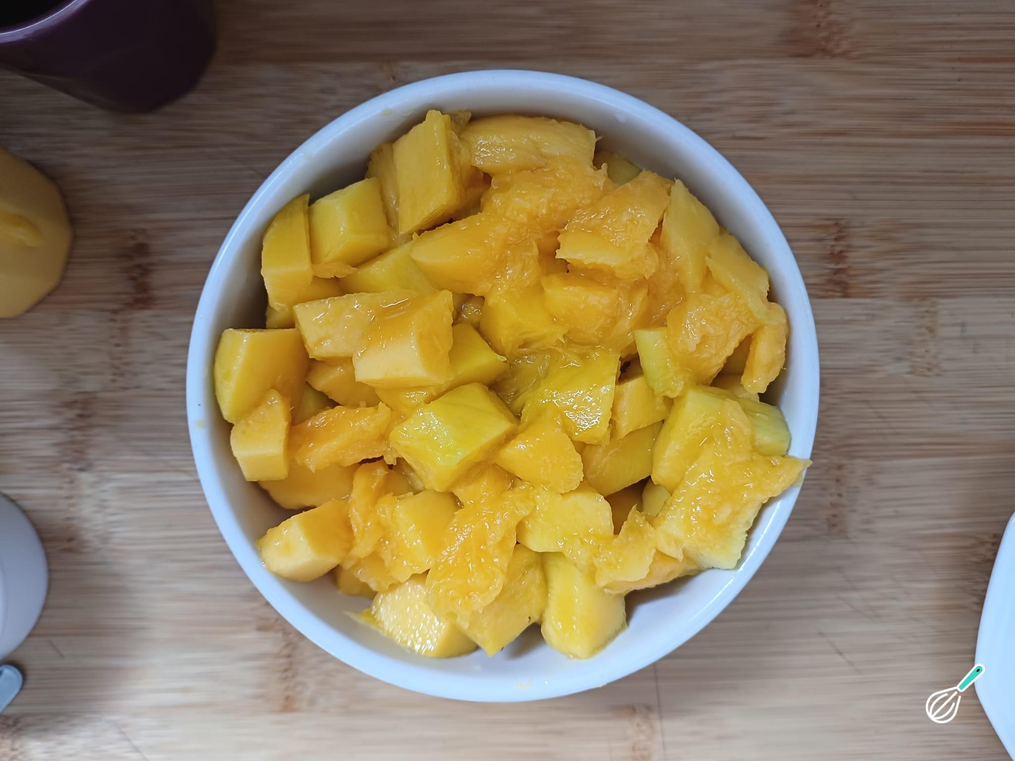 Descasque a manga e corte-a em cubinhos. Reserve.