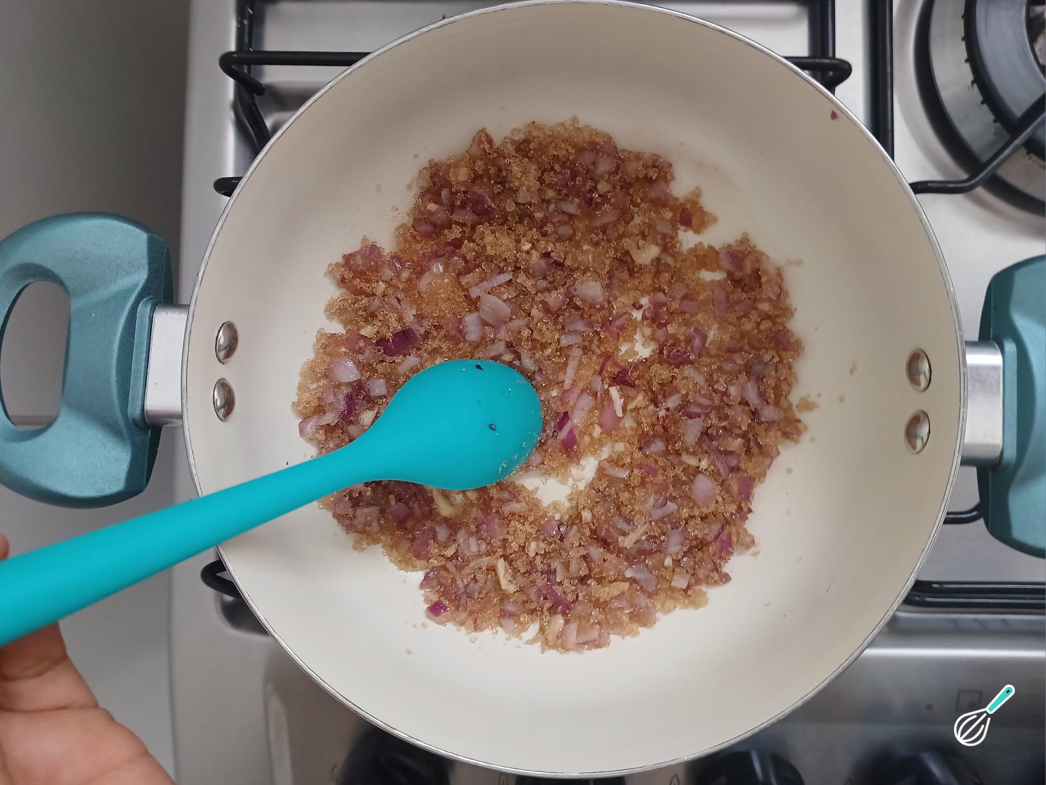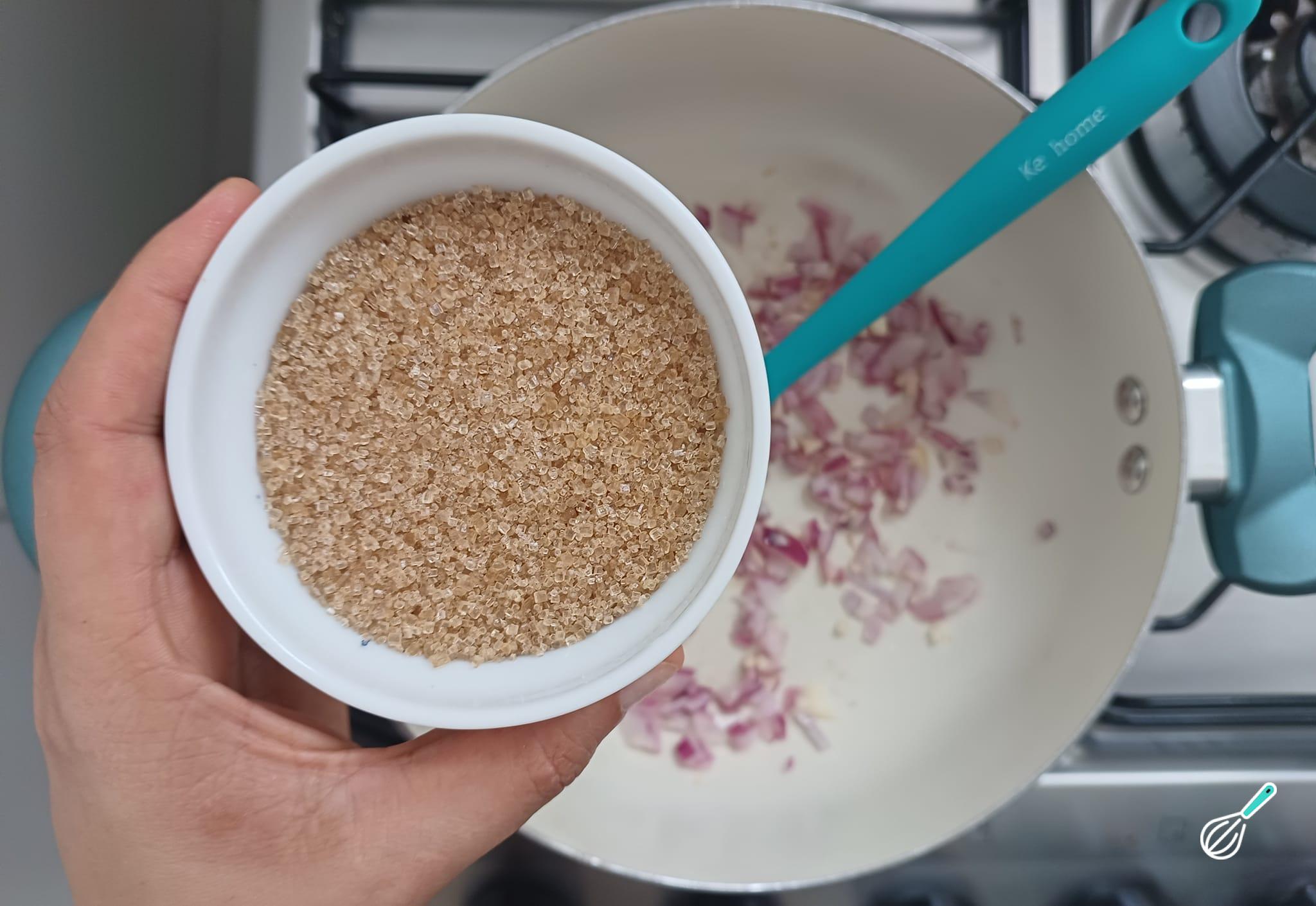 Depois que refogar um pouco, adicione o açúcar e deixe cozinhar em fogo baixo.