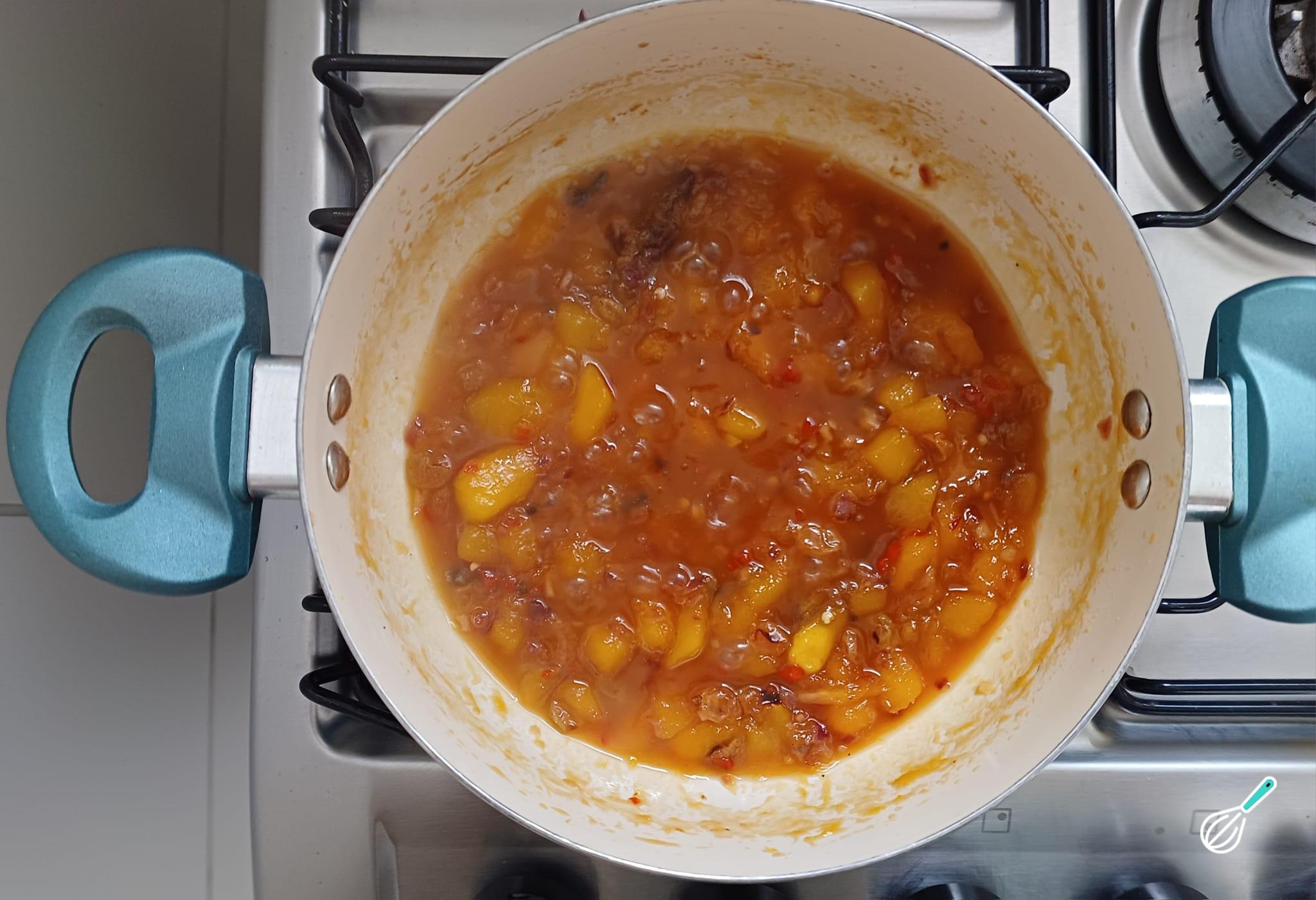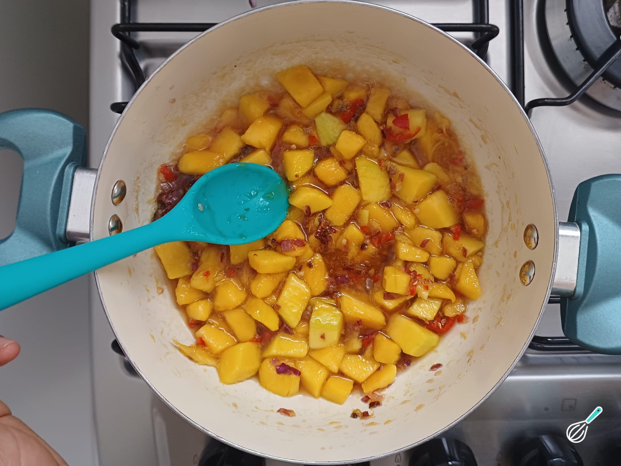 Neste momento, adicione a manga e a pimenta e deixe cozinhando alguns minutos.
