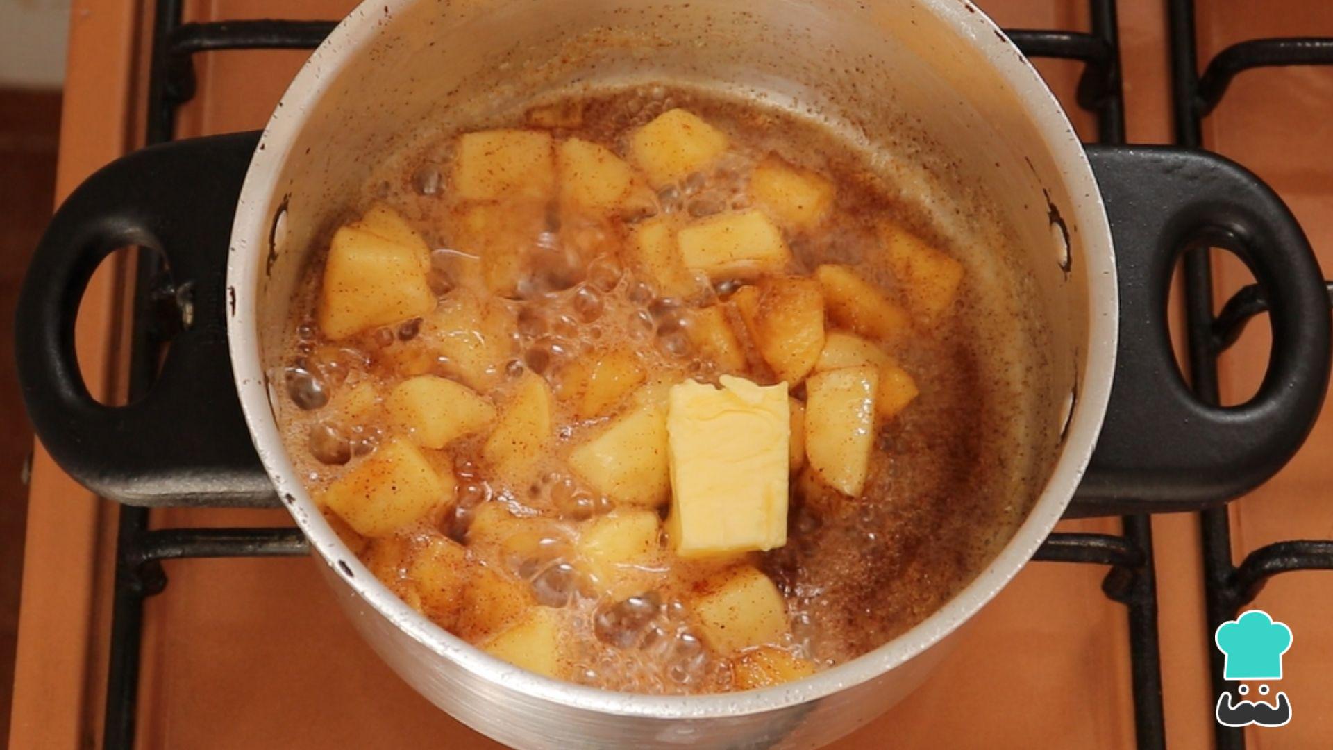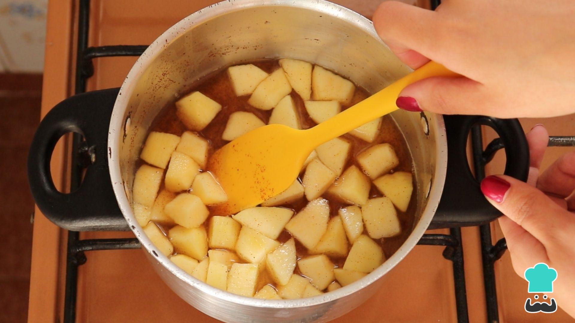 Assim que ferver, acrescente a maçã em cubos e mexa bem. Cozinhe em fogo baixo, mexendo de vez em quando, por 15 minutos ou até essa calda de maçã encorpar e a maçã ficar macia.