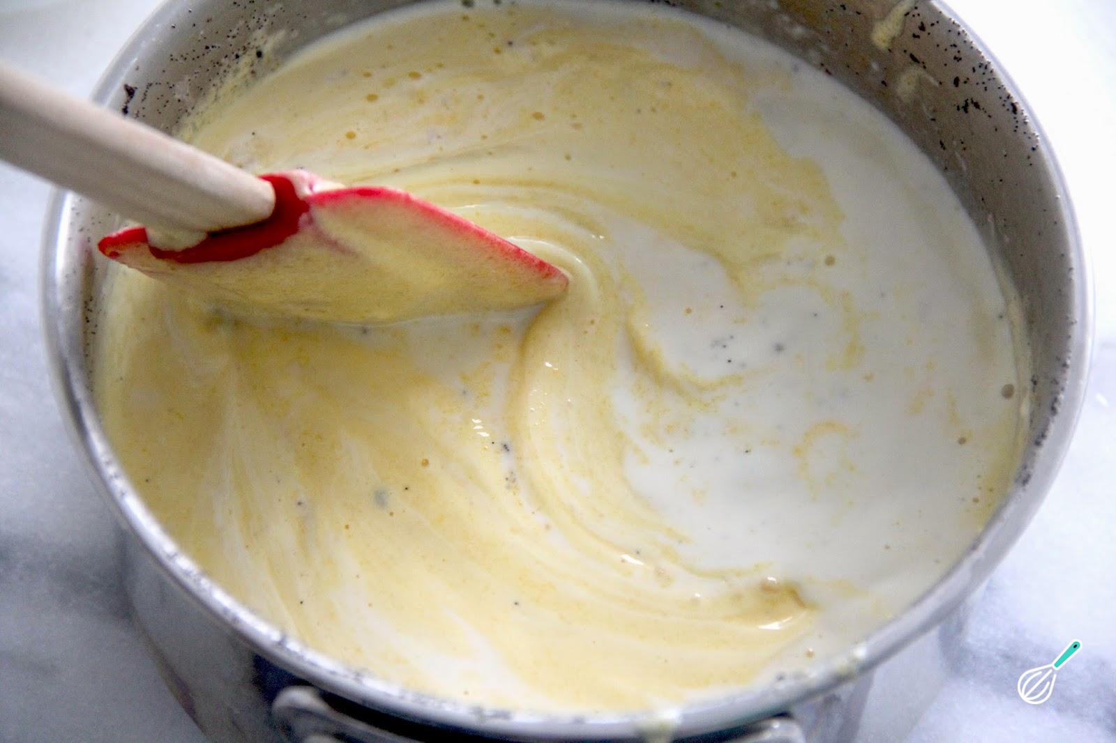 À parte, esquente o leite até ferver. Depois desligue, deixe amornar um pouco, e adicione pouco a pouco à mistura de ovos, enquanto mexe.