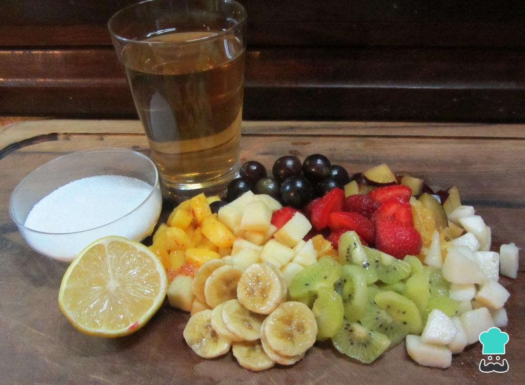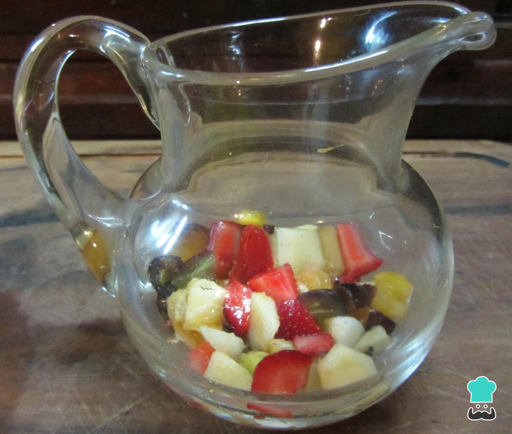 Coloque as frutas cortadas em uma jarra de vidro, adicione o açúcar e deixe repousar durante 30 minutos, para que as frutas larguem o seu suco e o clericó argentino fique perfeito.