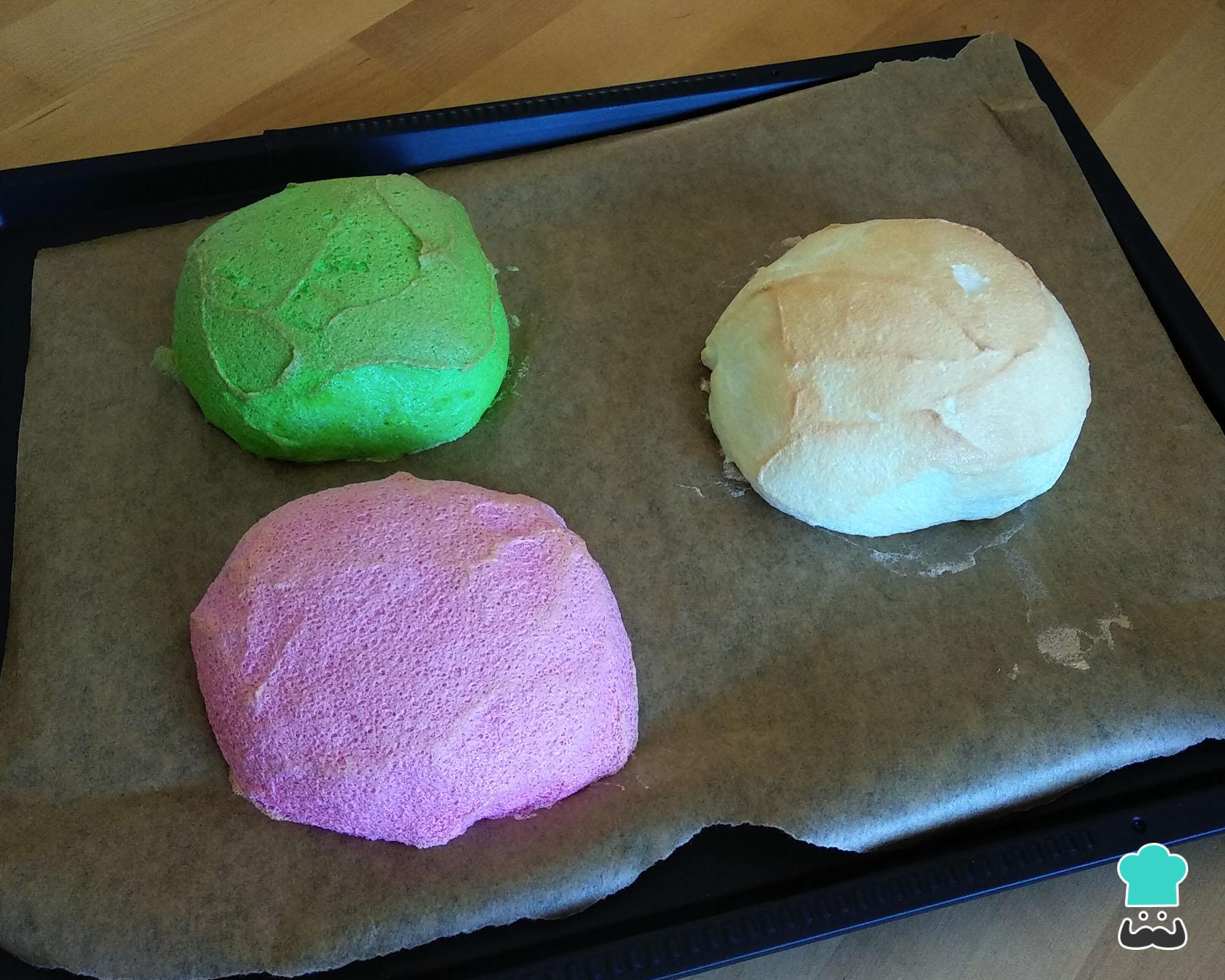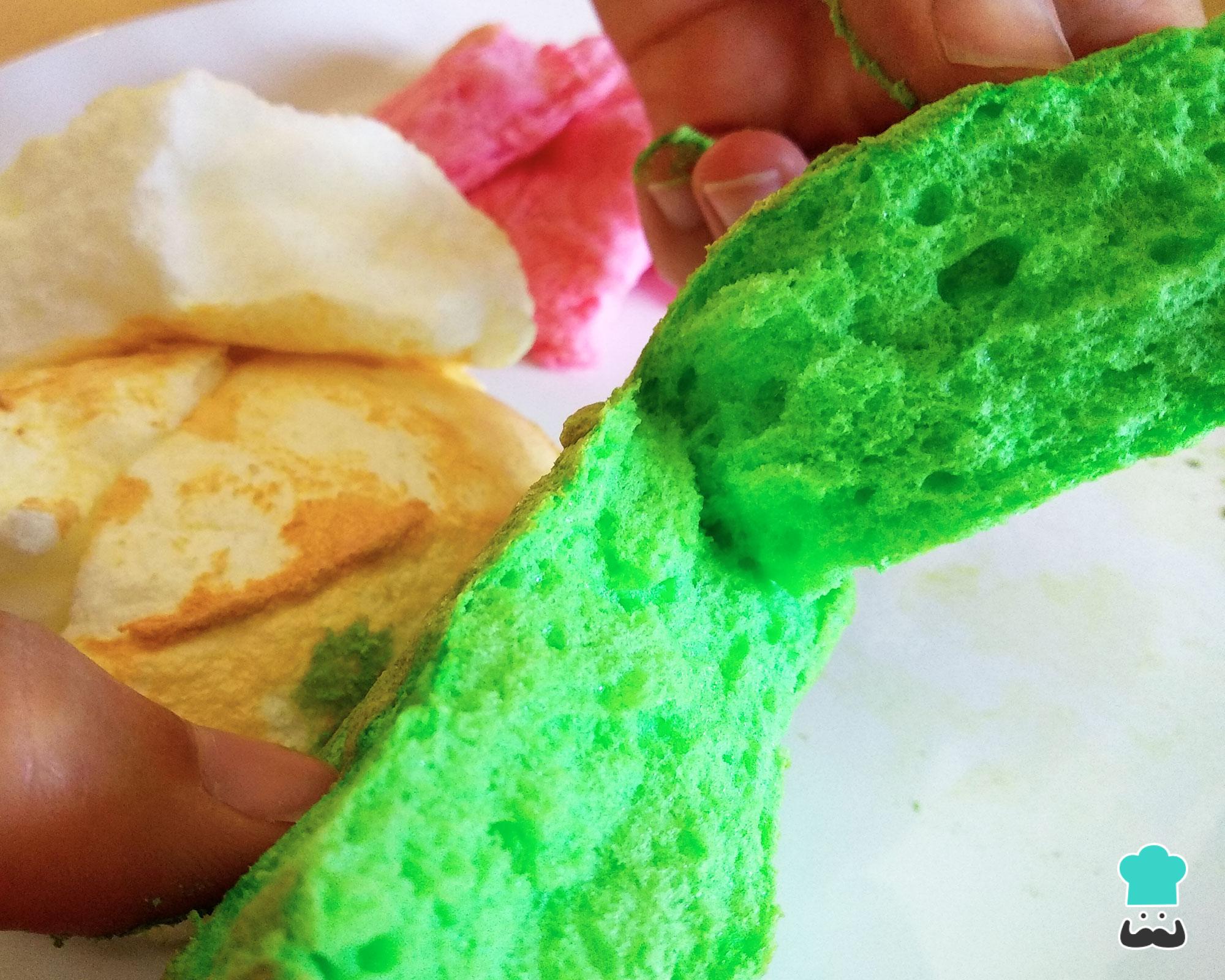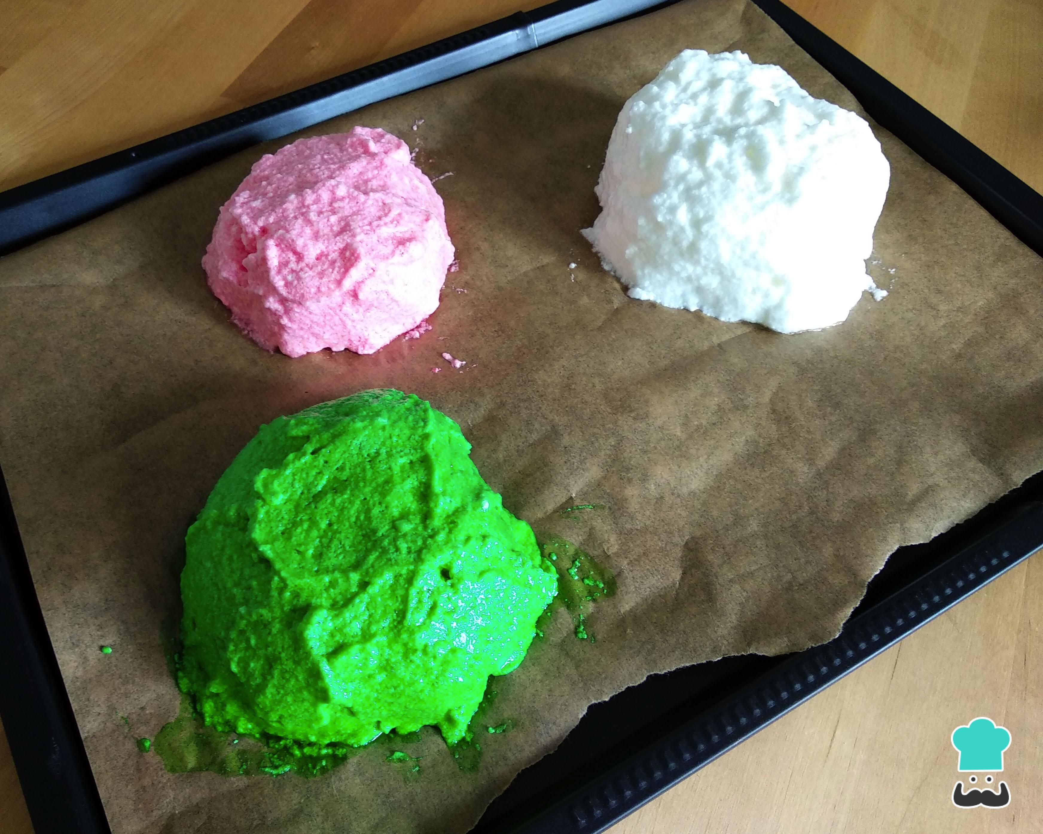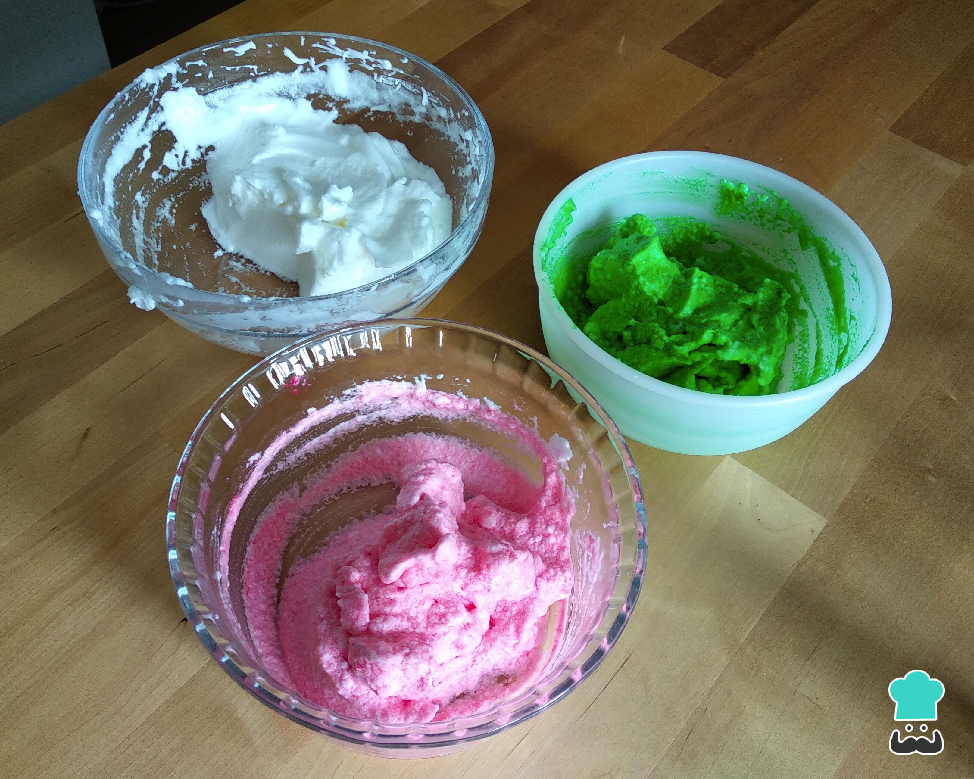 Se você quiser preparar este pão-nuvem com diferentes cores, separe porções do merengue em tigelas diferentes. Neste caso separei 1/3 para colorir de verde e outro 1/3 para colorir de cor-de-rosa. Use apenas algumas gotas de corantes alimentícios em gel ou líquidos para colorir o merengue e misture suavemente, para não perder o ar.