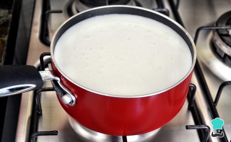 O primeiro passo da receita da coalhada consiste em levar o leite ao fogo médio para ferver. Quando isso acontecer, desligue.