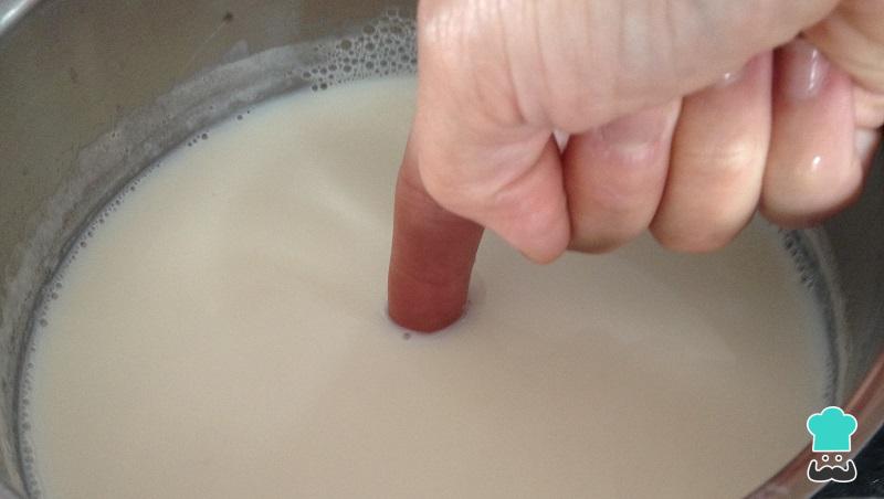 Deixe o leite amornar até aos 36-37ºC. Se você não tiver forma de medir a temperatura, faça do seguinte jeito: afunde seu dedo indicador no leite e conte até dez, se o calor for suportável é porque o leite se encontra na temperatura ideal.