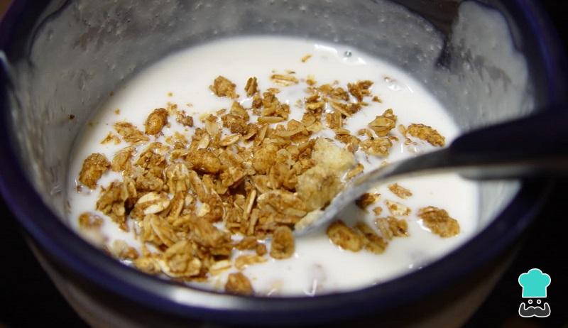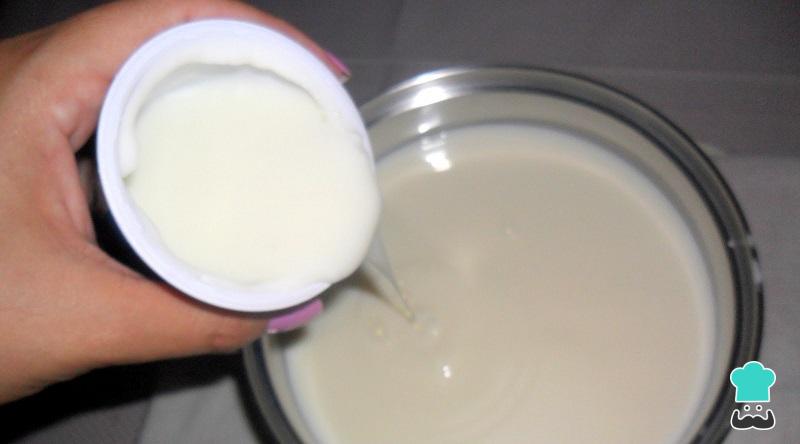 Numa tigela misture o leite em pó com os iogurtes até conseguir uma consistência homogênea de creme. Adicione ao leite morno e mexa bem para envolver.