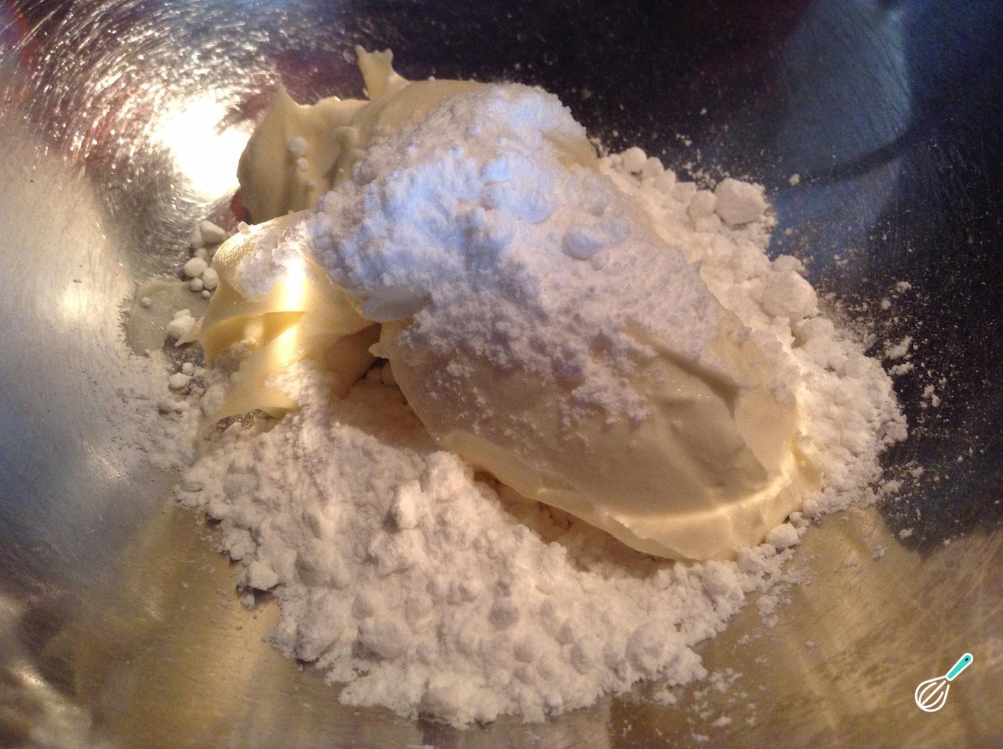 Numa taça funda, coloque a manteiga, o queijo e o açúcar de confeiteiro. Com a ajuda de um batedor manual ou batedeira elétrica, misture bem estes ingredientes.