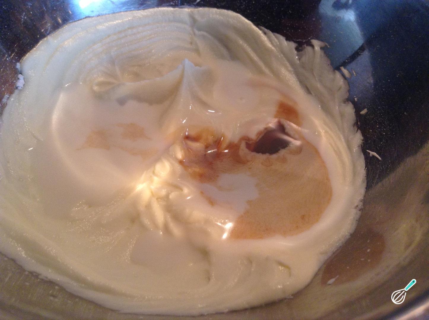 Adicione a essência de baunilha e bata até incorporar. Em seguida, adicione o leite e bata novamente.
