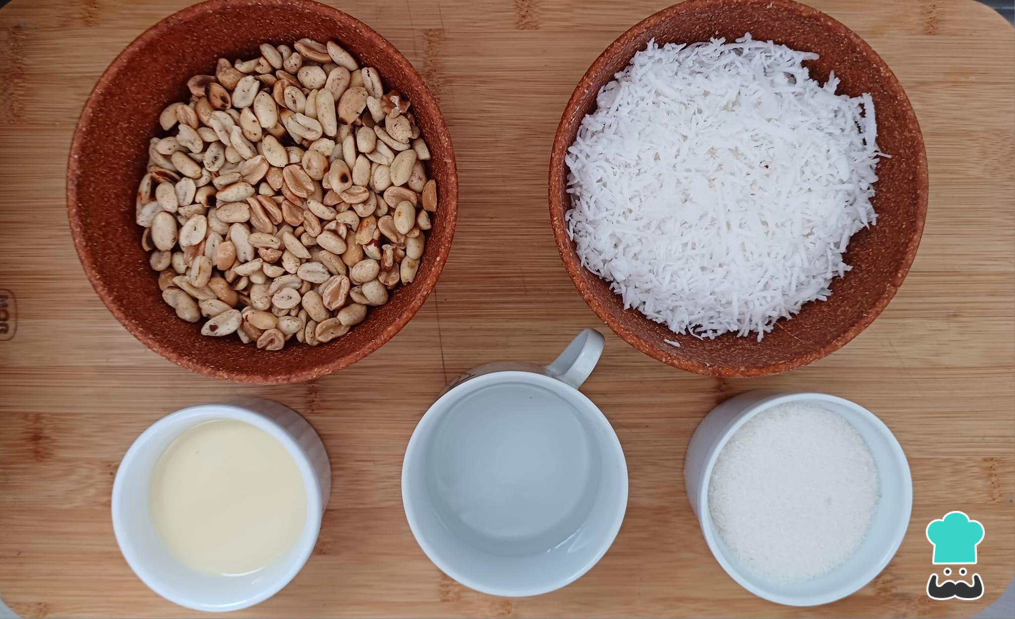 Separe os ingredientes necessários para preparar esta receita de cocada de amendoim.