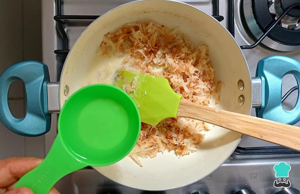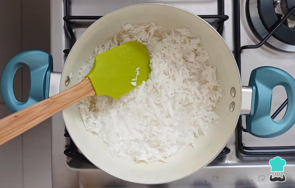 Numa panela média, junte 150 ml de água, coco ralado e açúcar, misturando bem antes de ir ao fogo.