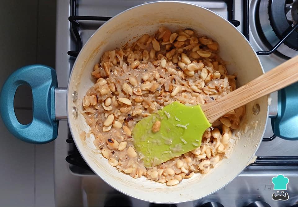 Adicione também o leite condensado e o amendoim, mexendo sem parar.
