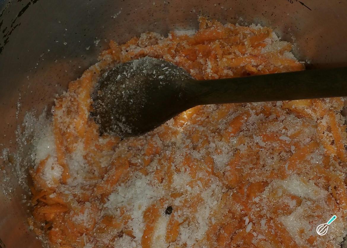 Rale as cenouras no ralo grosso e coloque numa panela com o coco ralado, o açúcar, o cravo e a canela. Misture tudo, leve ao fogo e fique mexendo por uns 20 minutos.